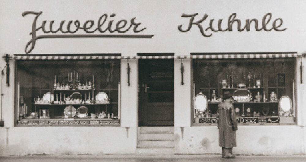 1908 begann die Geschichte unseres Unternehmens – damals in Nürnberg, an der Tuchgasse 1 am Hauptmarkt. Gründer Adolf Kuhnle, Christoph Kuhnles Urgroßvater, kam gebürtig aus Schwäbisch-Gmünd. In der elterlichen Goldschmiedefabrik hatte er als sechstes von sieben Kindern keinen Platz, und so wagte er, als sein Sohn Bruno geboren wurde, den Sprung in die Selbständigkeit. Eine gute Entscheidung, denn „Juwelier Kuhnle, Uhren oder Schmuck“ gedieh ebenso wie der Sohn, und schon im dritten Jahrzehnt nach der Gründung führten beide das prosperierende Geschäft gemeinsam.
