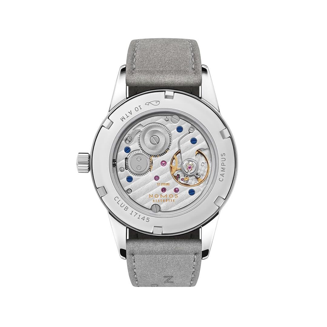In jeder Club Campus arbeitet das zuverlässige Handaufzugswerk Alpha - ein präzises Kaliber, das in sechs Lagen feinreguliert ist und eine beeindruckende Gangreserve von bis zu 43 Stunden bietet. Die rhodinierten Werkoberflächen mit Glashütter Streifenschliff und NOMOS-Perlage zeugen von höchster handwerklicher Perfektion