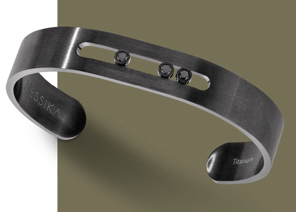 Titan ist das Gold des Mannes. Das Metall, das schon im Weltraum war, macht den Männerschmuck von Messika unverwüstlich. Der Armreif mit drei beweglichen schwarzen Diamanten könnte als Symbol für drei bedeutsame Dinge Ihrer Liebe stehen.