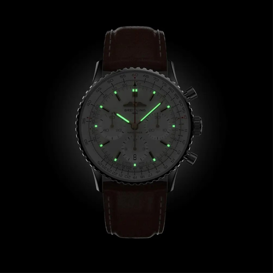 Silberfarben mit farblich abgesetzten Chronographenzählern und applizierten Indizes
