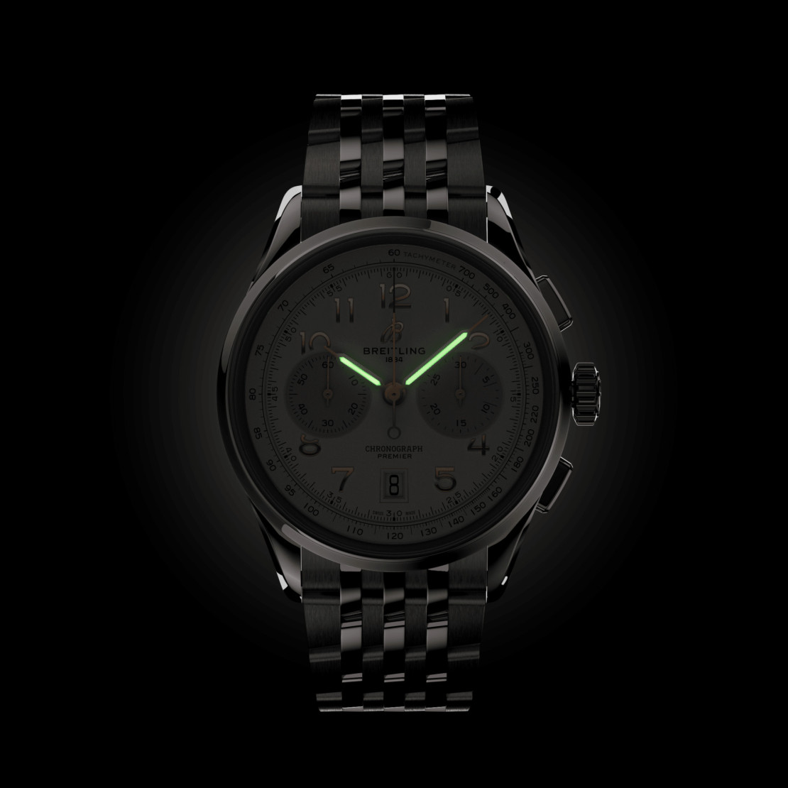 Der Premier B01 Chronograph 42 ist in verschiedenen Zifferblattfarben und Gehäusematerialien erhältlich. Sie ist wahlweise mit einem klassischen Alligatorlederarmband oder einem eleganten siebenreihigen Metallarmband erhältlich. Auch die heutige Premier entspricht den kompromisslosen technischen Standards von Willy Breitling mit ihrem aussergewöhnlichen Uhrwerk mit Selbstaufzug—dem COSC-zertifizierten Breitling-Manufakturkaliber 01—, welches auf höchste Präzision, Zuverlässigkeit und Funktionalität ausgelegt ist.