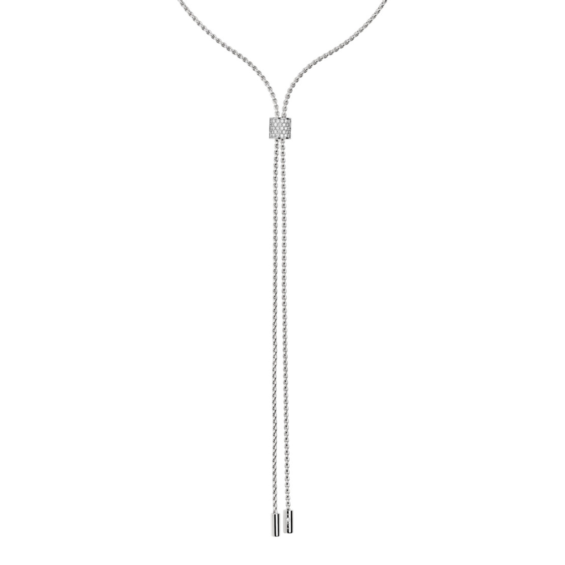 Ref. 89403CX_BB_B_BBX_070 - Aria besteht aus einer neuen zarten, feinmaschigen Goldkette und richtet sich an aufstrebende Luxuskonsumenten, die den Athleisure-Modetrend aufgreifen. Die Stücke der Aria-Kollektion (Ohrringe und Halsketten) wurden so entworfen, dass sie in den drei Goldfarben gemischt und aufeinander abgestimmt werden können, mit goldenen Zylindern, die mit weißen oder schwarzen Diamanten besetzt sind, für Damen und Herren.