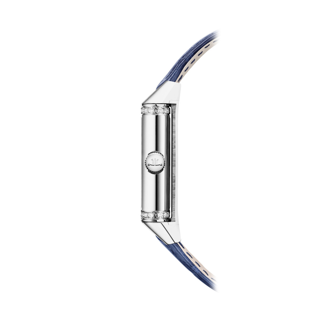 Ref. 3348420 - Der Zeitmesser ist nach dem Duetto Konzept benannt, das mit einem einfachen Handgriff zwei Zifferblätter und einen doppelten Zeigersatz offenbart, die durch ein einziges Uhrwerk angetrieben werden. Die neue Reverso One Duetto in Blau und Edelstahl besticht außerdem durch ihre Doppelreihe an Diamanten im Brillantschliff auf der Vorder- und Rückseite der Uhr. Ein neues Lederarmband in strahlendem Blau vervollständigt diesen wunderschönen, vom Stil des Art déco inspirierten Zeitmesser.