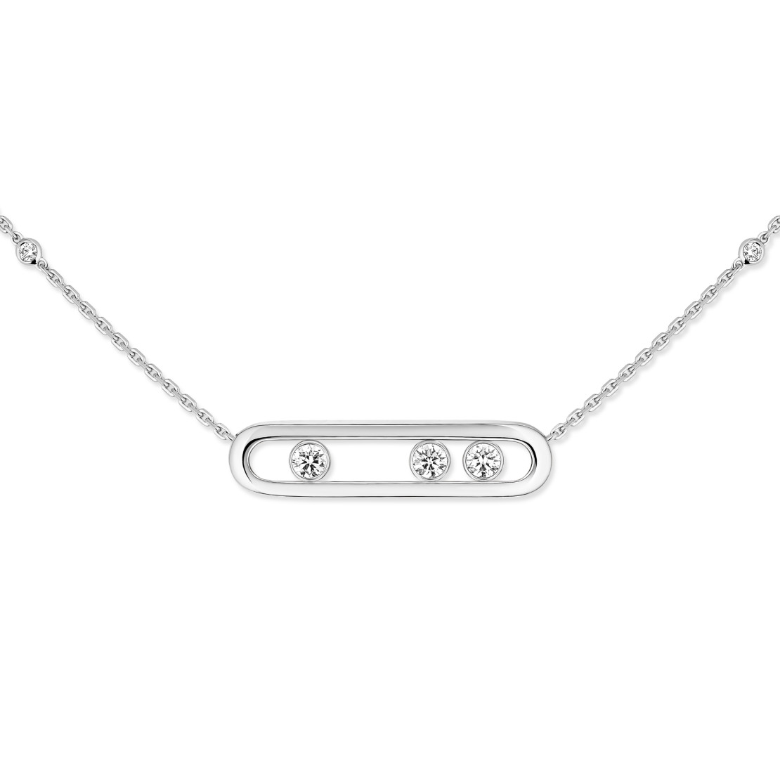 Ref. 03997-WG - Innerhalb von zehn Jahren, hat sich die Move Kollektion über den Status des „It“-Schmucks hinausentwickelt und geht nun in als ikonische Kollektion in die Schmuckgeschichte ein. Die Move Schmuckstücke sind voller Poesie, mit ihren drei Diamanten, die fest in ihren kostbaren Bahnen sitzen. Die Bewegung der Steine entsprang einer Kindheitserinnerung Valerie Messikas: „Als ich ein kleines Mädchen war, spielte mein Vater immer mit den Diamanten in seinen Händen, wenn er sie mir zeigte. Das Licht erweckte sie zum Leben und so konnte ich einen bunten Regenbogen in den Steinen sehen. Ich wollte diese Magie der Diamanten neu erschaffen“.