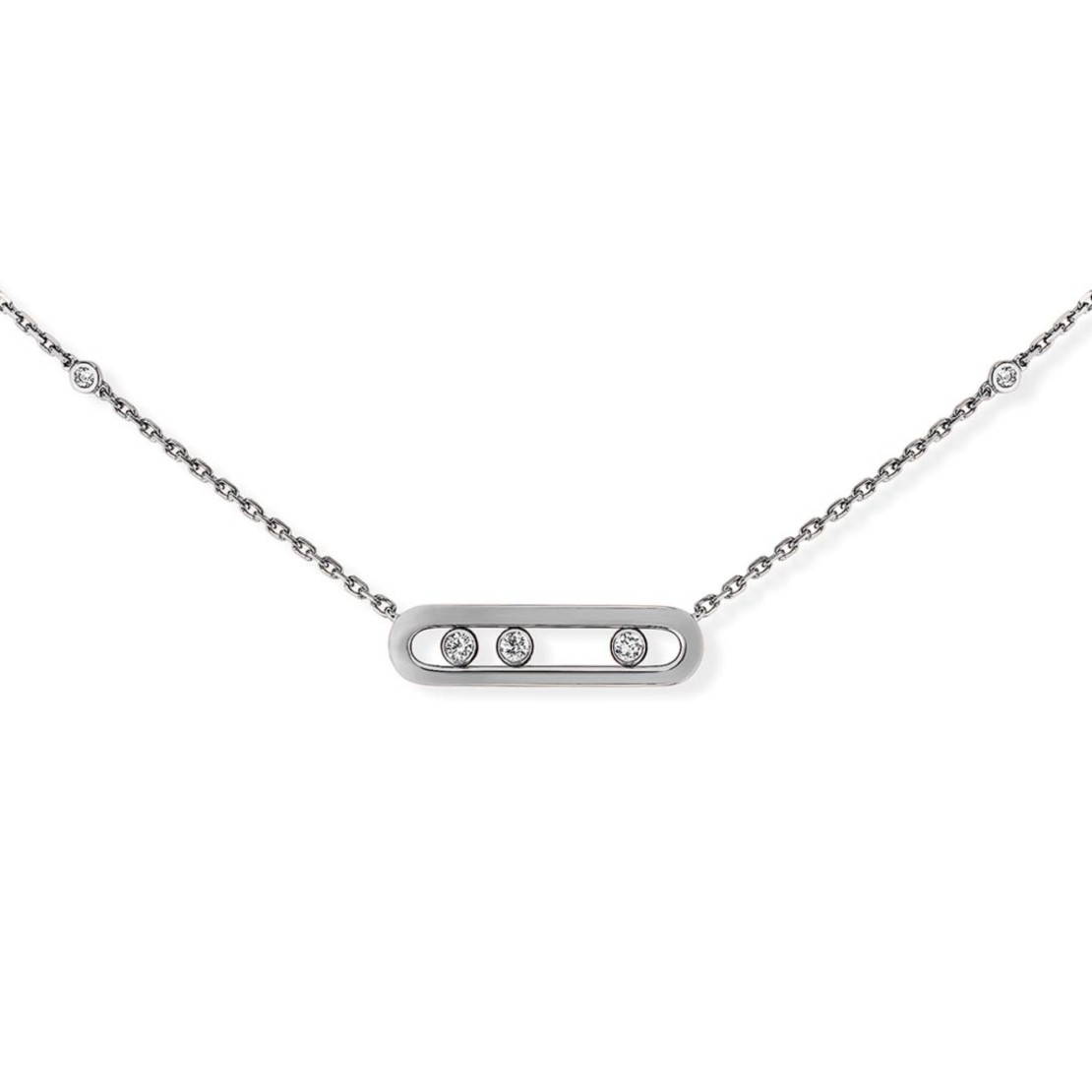Ref. 04323-WG - Innerhalb von zehn Jahren, hat sich die Move Kollektion über den Status des „It“-Schmucks hinausentwickelt und geht nun in als ikonische Kollektion in die Schmuckgeschichte ein. Die Move Schmuckstücke sind voller Poesie, mit ihren drei Diamanten, die fest in ihren kostbaren Bahnen sitzen. Die Bewegung der Steine entsprang einer Kindheitserinnerung Valerie Messikas: „Als ich ein kleines Mädchen war, spielte mein Vater immer mit den Diamanten in seinen Händen, wenn er sie mir zeigte. Das Licht erweckte sie zum Leben und so konnte ich einen bunten Regenbogen in den Steinen sehen. Ich wollte diese Magie der Diamanten neu erschaffen“.