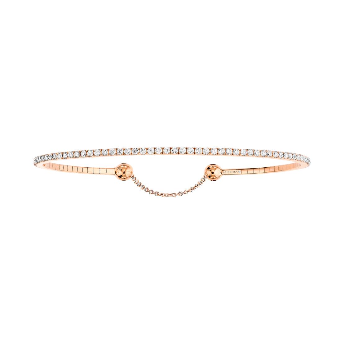 Ref. 06097-PG - Dieses handgefertigte Armband aus 18 Karat Roségold ist vollständig mit Diamanten im Brillantschliff mit einem Gesamtgewicht von 0,80 Karat besetzt. Sein schimmerndes Roségold, eine speziell von Messika entwickelte Legierung, verleiht dem Handgelenk Weichheit und Leichtigkeit. Dieses Diamantarmband ist ein Schmuckstück wie eine zweite Haut von extremer Flexibilität dank eines Systems aus unsichtbaren Nanofedern und lässt sich sehr einfach an- und ausziehen. Die Finesse der Fassung und die Brillanz der Diamanten machen dieses Schmuckstück zum idealen Geschenk für alle Gelegenheiten. Tipp: Tragen Sie es alleine oder in Kombination mit einem anderen Skinny-Armband oder mit einem Messika-Armreif aus der Move-Kollektion.