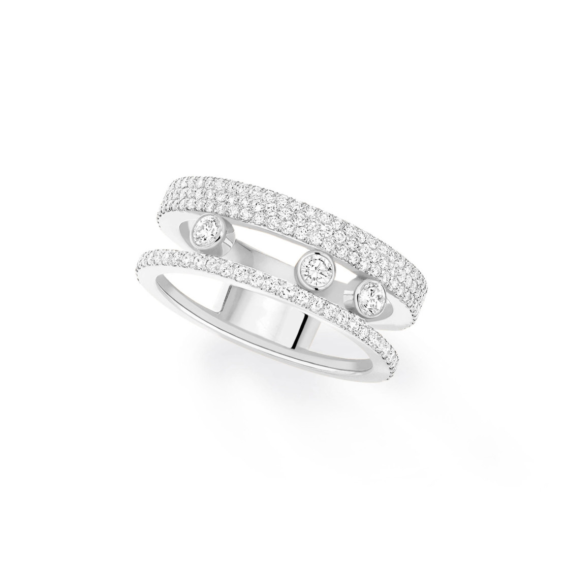 Ref. 07128-WG - Romane. Grafisches Design. Ein Stil. Dieser Diamantring aus 18 Karat Weißgold im Anhäufungsstil setzt auf die Verbindung eines mit Diamanten in Mikro-Fassung ausgefassten Eherings und einem in Kornfassung mit Diamanten ausgefassten Eherings. Im Herzen ihres grafischen und klaren Designs bewegt sich ein Diamant. Drei Diamanten sind das perfekte Symbol für die Liebe von gestern, heute und morgen. Eine gerade, luftige Linie für einen absolut modischen Diamantring aus Roségold. Der Glanz des Weißgoldes verstärkt die Reinheit der Diamanten und somit ihr atemberaubendes Schillern. Entdecken Sie den Diamantschmuck und die Diamantringe aus Roségold aus der Kollektion Move Romane: Kühne Kreationen zwischen Modernität und Originalität.