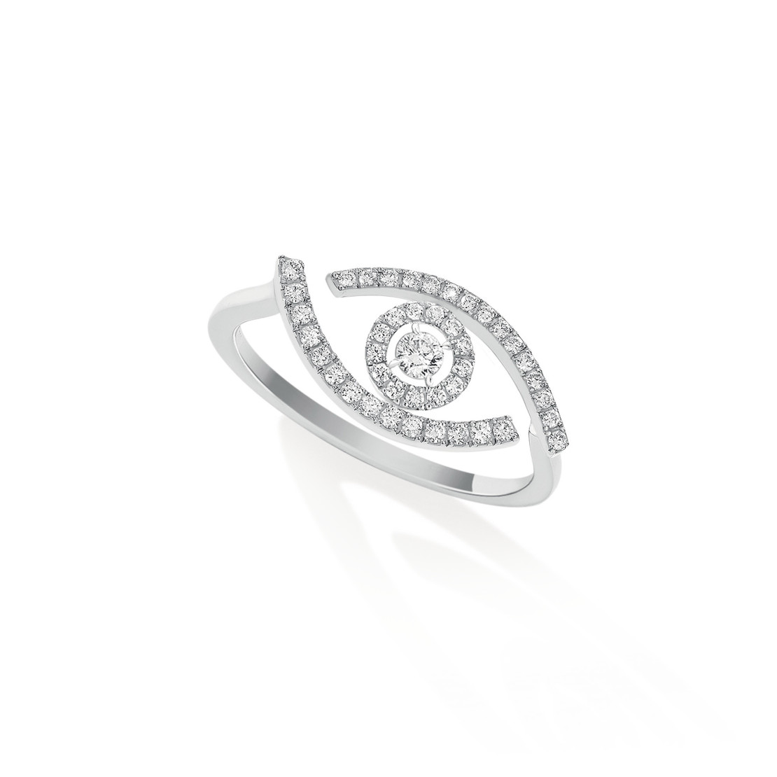 Ref. 10037-WG - Das Auge gilt seit Jahrhunderten als Glückssymbol. Im Nahen Osten, in der Türkei und in Griechenland schützt es als Talisman vor dem bösen Blick. Die Schmuck- und Haute Joaillerie-Maison Messika interpretiert es mit ihrem modernen und femininen Touch neu. Der mit Diamanten ausgefasste Lucky Eye Diamantring aus Weißgold schillert in tausend Facetten: Die mit Diamanten ausgefassten Konturen des Auges vereinen sich mit dem zentralen Diamant von 0,03 Karat und seiner Umrandung aus Diamanten in Mikro-Fassung. Er schmiegt sich eng an die Haut an.