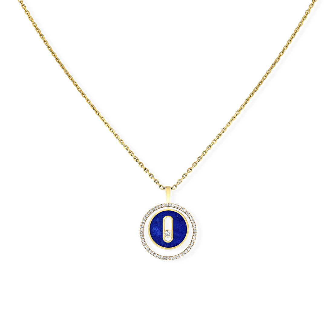 Ref. 11978-YG - Für Frauen, die sich gern geheimnisvoll geben, ist die Lucky Move Kette aus Gelbgold, Diamant und Lapislazuli der perfekte Begleiter. Lapislazuli ist ein Symbol des Schutzes und ein Edelstein, der sich durch seine tiefblaue Intensität auszeichnet, die mit goldenen metallischen Kristallen, Pyrit genannt, durchsetzt ist. Ähnlich einem Sternenhimmel verbindet sich seine nächtliche Farbe wunderbar mit der sonnigen Leuchtkraft des Gelbgoldes und dem Funkeln der Diamanten. Diese Diamantkette für Damen ist an einer verschiebbaren Kette aus Gelbgold befestigt und kann an all Ihre Dekolletés angepasst werden! Die Medaille dreht sich um sich selbst und ist von einem schillernden Diamantkreis aus Licht umgeben. Schimmernde Reflexe, Glanz und Bewegung machen dieses Schmuckstück zu einem Talisman, der bei allen Gelegenheiten getragen werden kann.