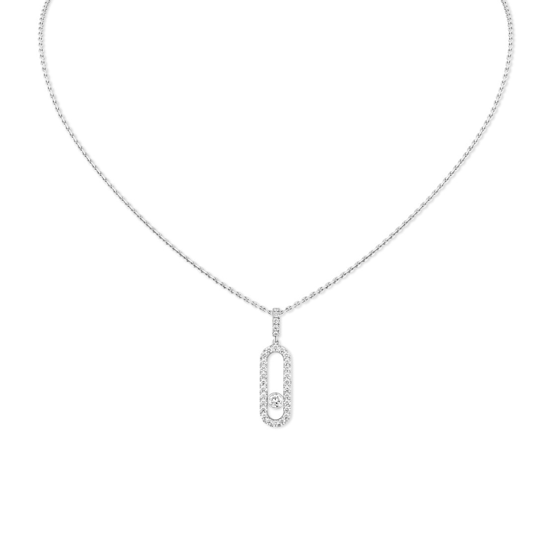 Ref. 12058-WG - Sie müssen nicht übertreiben, um zu strahlen. Mit diesem großen Modell der mit Diamanten ausgefassten Move Uno Diamantkette aus Weißgold werden Sie alle Blicke auf sich ziehen! Diese mit Diamanten ausgefasste Damenkette mit einem zentralen beweglichen Diamanten besticht durch ihr raffiniertes Design zwischen Eleganz und Modernität. Allein getragen wird sie Ihrem Outfit den letzten Schliff verleihen. In Kombination mit anderen Ketten der Move Schmuckkollektion sorgt sie für einen angesagten Look. Warum diese anstelle einer anderen? Besonders schätzen werden Sie ihren Schiebeverschluss, mit dem Sie sie je nach Dekolleté in der gewünschten Länge tragen können.