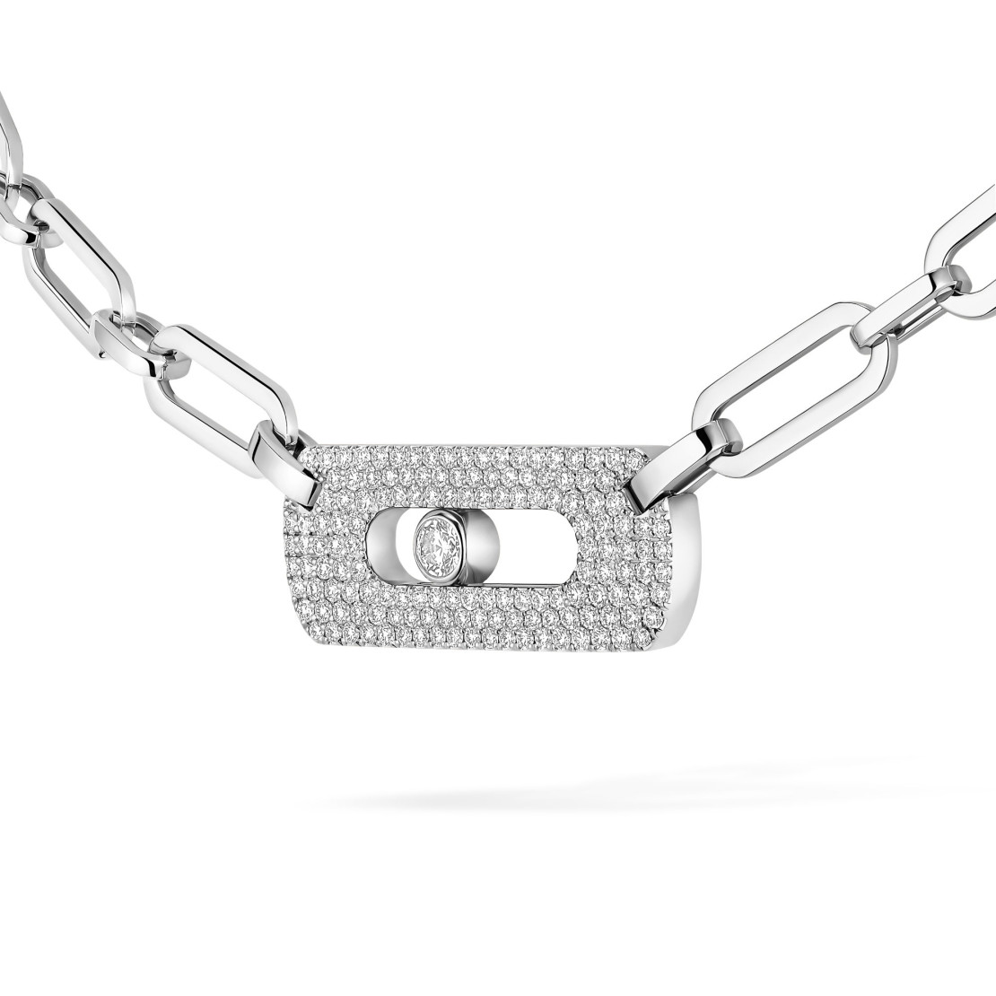 Ref. 12095-WG - Selbstbewusst, kühn und feminin: Diese eng anliegende Move Link Diamantkette aus Weißgold hat alles, um zu gefallen. Die handgefertigte XXL-Kette aus 18 Karat Weißgold erinnert an die Gliederketten der 1960er Jahre. In der Mitte das unverkennbare Motiv der Maison mit seinem beweglichen Diamanten, dem Markenzeichen von Messika. Klare Linien, präzise Proportionen und kostbare Details sind Werte, die der Gründerin Valérie Messika am Herzen liegen und die sich an dieser Halskette wiederfinden, die sich perfekt für einen grafischen und äußerst trendigen Look eignet.