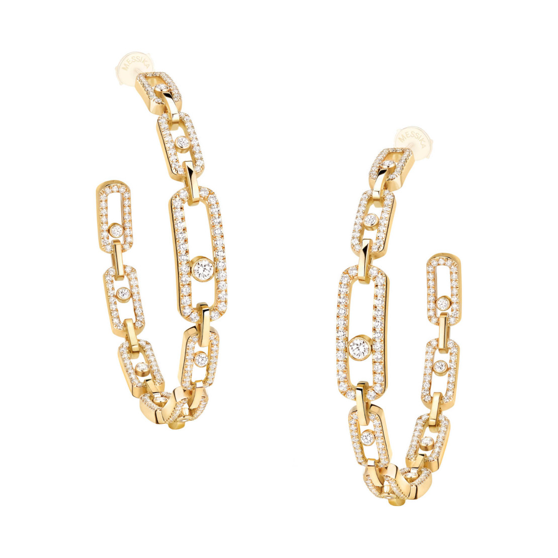 Ref. 12362-YG - Diese Diamantcreolen sind das ultimative Must-have der Move Link Schmuckkollektion. Sie sind ultratrendy und schmücken jedes Outfit im Handumdrehen mit ihren beweglichen Diamanten in einer Abwandlung des Move-Motivs, dem Kultdesign der Maison. Diese luxuriösen Ohrringe, die vollständig mit Diamanten ausgefasst sind, funkeln bei jeder Bewegung und verleihen einen rockigen, gewagten Look. Als moderne Neuinterpretation der Gliederkette sind sie in verschiedenen Durchmessern und in den drei Farben des Edelmetalls erhältlich: in Gelbgold wie hier, in Roségold oder in Weißgold. Diese mittlere Größe entspricht einem Durchmesser von 4,8 cm.