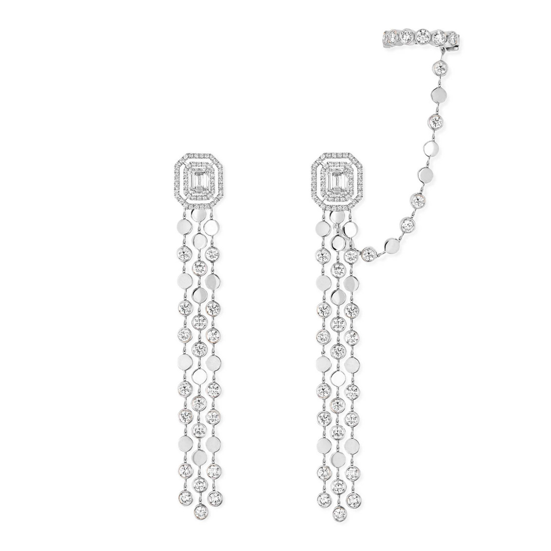Ref. 12432-WG - Die mehrreihigen D-Vibes Ohrringe aus Weißgold und Diamanten sind grafisch und grazil und verleihen jedem Ihrer Looks das gewisse Etwas. Sie sind abwechselnd mit Motiven aus Gold und mit Diamanten besetzt und verfügen über 2 Diamanten im Smaragdschliff von je 0,30 Karat, die Ihren Kopfschmuck zum Strahlen bringen werden. Gleich einer Skulptur stehen die Diamantohrringe für Damen für sich und verleihen jedem Look Anmut und Einzigartigkeit.
