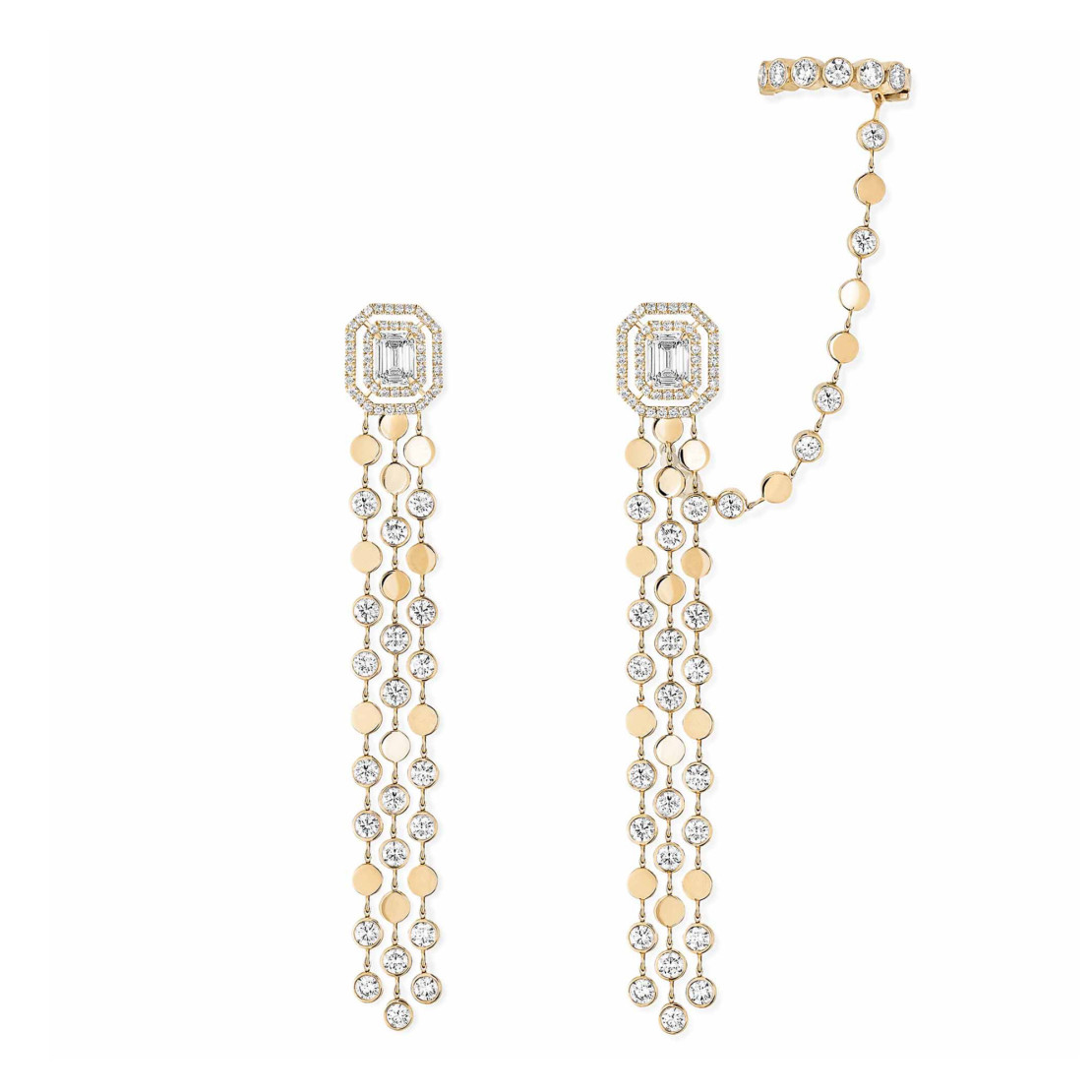 Ref. 12432-YG - Entdecken Sie die mehrreihigen D-Vibes Ohrringe aus Gelbgold und Diamanten! Sie werden von Hand gefertigt und spielen mit der Geschmeidigkeit des Gliederdesigns, sodass sie jeder Bewegung des Halses folgen und das Licht mit ihrem Diamant-Pavé sowie mit den 2 Diamanten im Smaragdschliff von 0,30 Karat einfangen, die jeden Ohrring schmücken! Gewagte Diamantohrringe für Frauen, die jedem Ihrer Looks einen Hauch von Glanz verleihen!