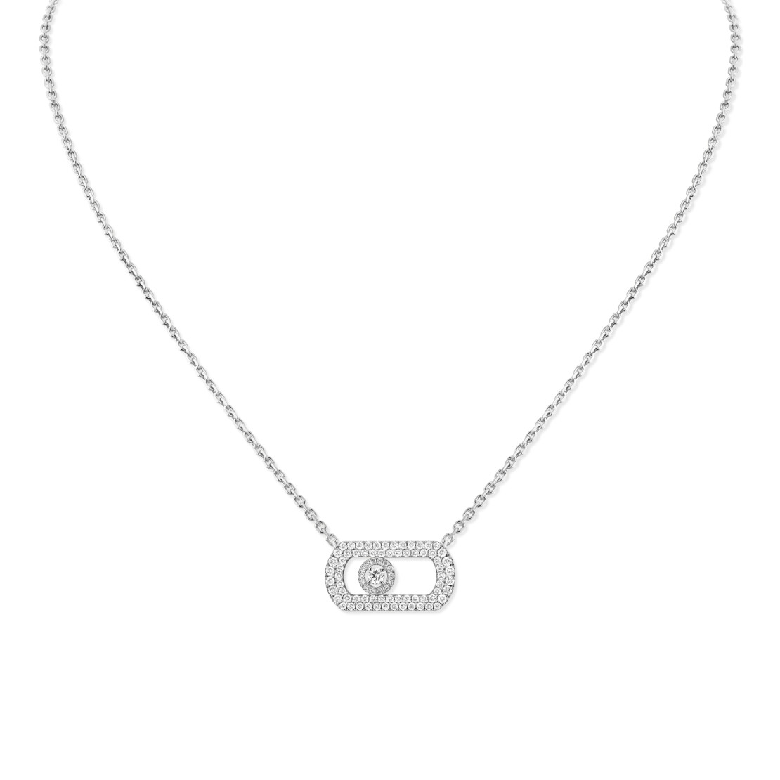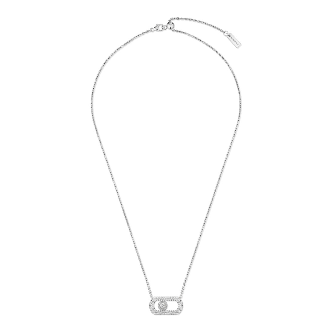 Ref. 12945-WG - Wenn Sie nach der ultimativen statuarischen Anhängerkette suchen, dann suchen Sie nicht weiter! Die So Move Diamantkette aus Weißgold ist die Messika Kreation, die Sie brauchen! Das Kultmotiv der Maison erfindet sich in einer noch kühneren und selbstbewussteren Version neu. Valérie Messika verleiht dem beweglichen Diamanten eine völlig neue Dimension mit skulpturaleren Konturen und einem beweglichen Diamanten, der dank seiner mit Diamanten besetzten Umgebung noch imposanter wirkt. Dieses neue Must-have für die Schmuckschatulle gibt es auch in Gelbgold und Roségold.