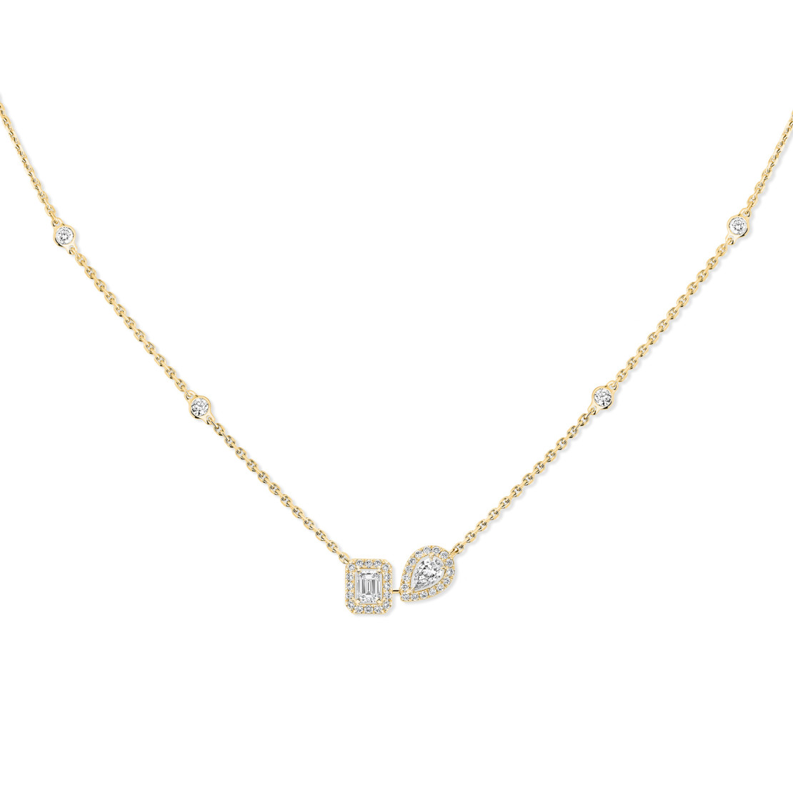 Ref. 14534-YG - Zwei Steine, zwei Charaktere, eine Vision: die einer selbstbewussten Dualität. Die My Twin Halskette aus Gelbgold und Diamanten zelebriert durch das Zusammentreffen von Diamanten im Smaragdschliff und Diamanten im Tropfenschliff jede Facette Ihrer Persönlichkeit. Der Signatur-Code der Maison, die subtil durchbrochene, mit Diamanten ausgefasste Umrandung, hebt die Volumen der zentralen Steine hervor und lässt das Licht um die Diamanten spielen. Die Neigung des Diamanten im Tropfenschliff ist eine kreative Kühnheit, die dem Schmuckstück einen schönen zeitgenössischen Akzent verleiht. Diese Halskette aus Gold und Diamanten kann einzeln oder in Kombination mit anderen Messika Kreationen getragen werden und wird Sie in Ihren intimsten und glanzvollsten Momenten begleiten.