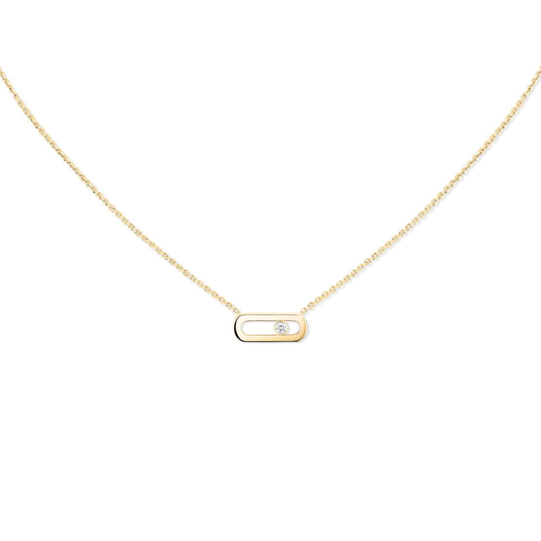 Ref. 14613-YG - Die Move Uno Diamantkette aus Gelbgold stammt aus der Move Kollektion der Maison für Schmuck und Haute Joaillerie Messika. Diese absolute Kultkollektion verdankt ihren Namen dem beweglichen Diamanten, der in der Mitte ihrer Kreationen schwingt. Diese von Hand aus 18 Gelbgold gefertigte Kreation besticht vor allem durch ihr schlichtes und elegantes Design. Egal ob Sie einen minimalistischen Look bevorzugen, indem Sie diese Messika Move Halskette allein tragen, oder sich für einen modischen Look entscheiden, indem Sie sie mit anderen Kreationen der Maison kombinieren – diese Diamantkette für Damen wird schnell zu Ihrer täglichen Begleiterin, die Ihr Dekolleté mit einem diskreten und kostbaren Glanz schmückt.