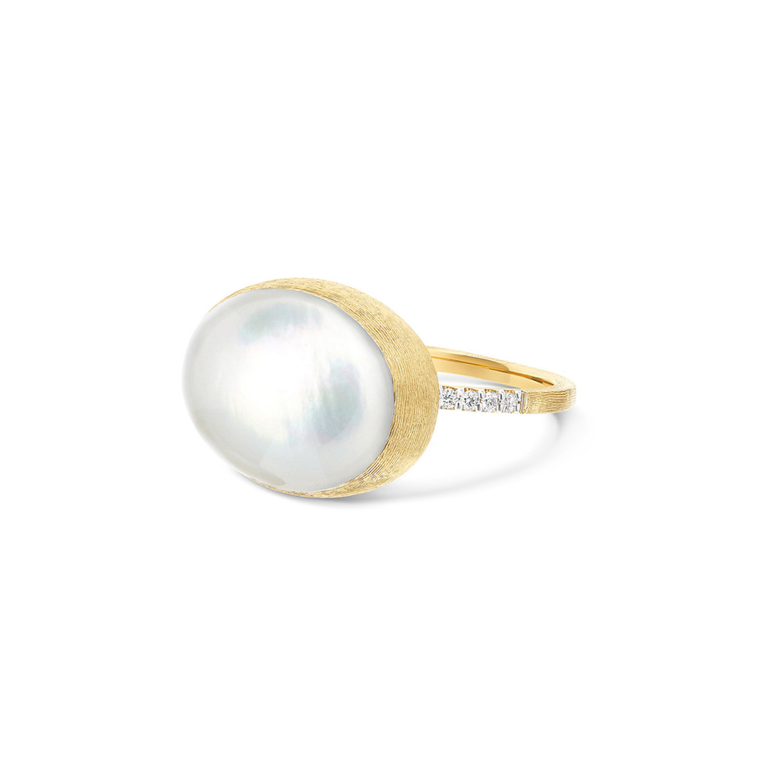 Ref. AS17-609 - Eine Sommernacht, eine sanfte Brise auf der Haut, der Himmel vom Mondschein erhellt. In dieser Atmosphäre erwacht der Ring Boules Dolcevita zum Leben: Perlmutt trifft auf Boule – die ikonische Form von Nanis – in einem Spiel aus schillernden Lichtreflexen, die den Glanz noch verstärken. Das Modell besteht aus von Hand graviertem 18 KT Gold, ergänzt durch Perlmutt für eine Komposition, die Licht und Materie zelebriert. Die Diamanten an den Seiten sorgen für einen sanften Schimmer, während die meisterhafte Konstruktion die Rundungen und die fließende Bewegung der Boule bewahrt.