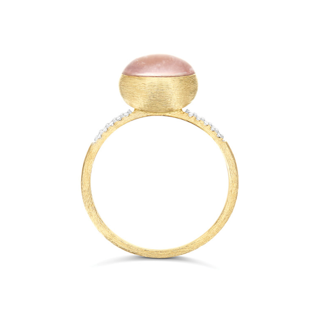 Ref. AS3-609 - Romantisch und geschmeidig - dieser Ring der Kollektion Boules, vom bekannten Rosolio inspiriert, verzaubert nicht nur durch seine Eleganz und Raffinesse, sondern auch durch seine besondere Bearbeitung. Denn in diesem Schmuckstück trifft das 18kt Gold auf eine Triplette aus Bergkristall, Erdbeerquarz und Perlmutt, und verschmilzt mit ihr, wodurch mit farbiger Lebendigkeit die ikonische Nanis Boule neu interpretiert wird.