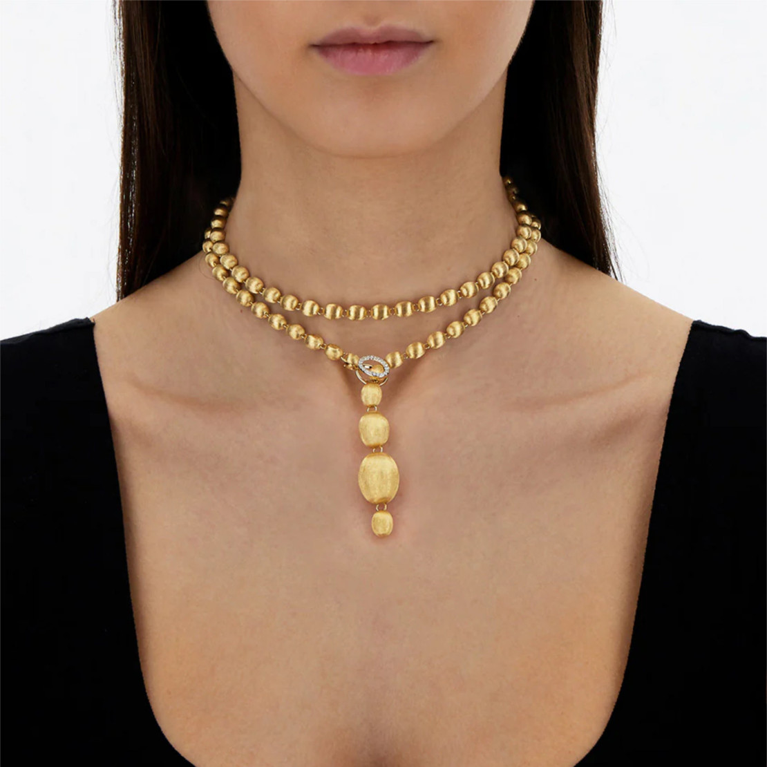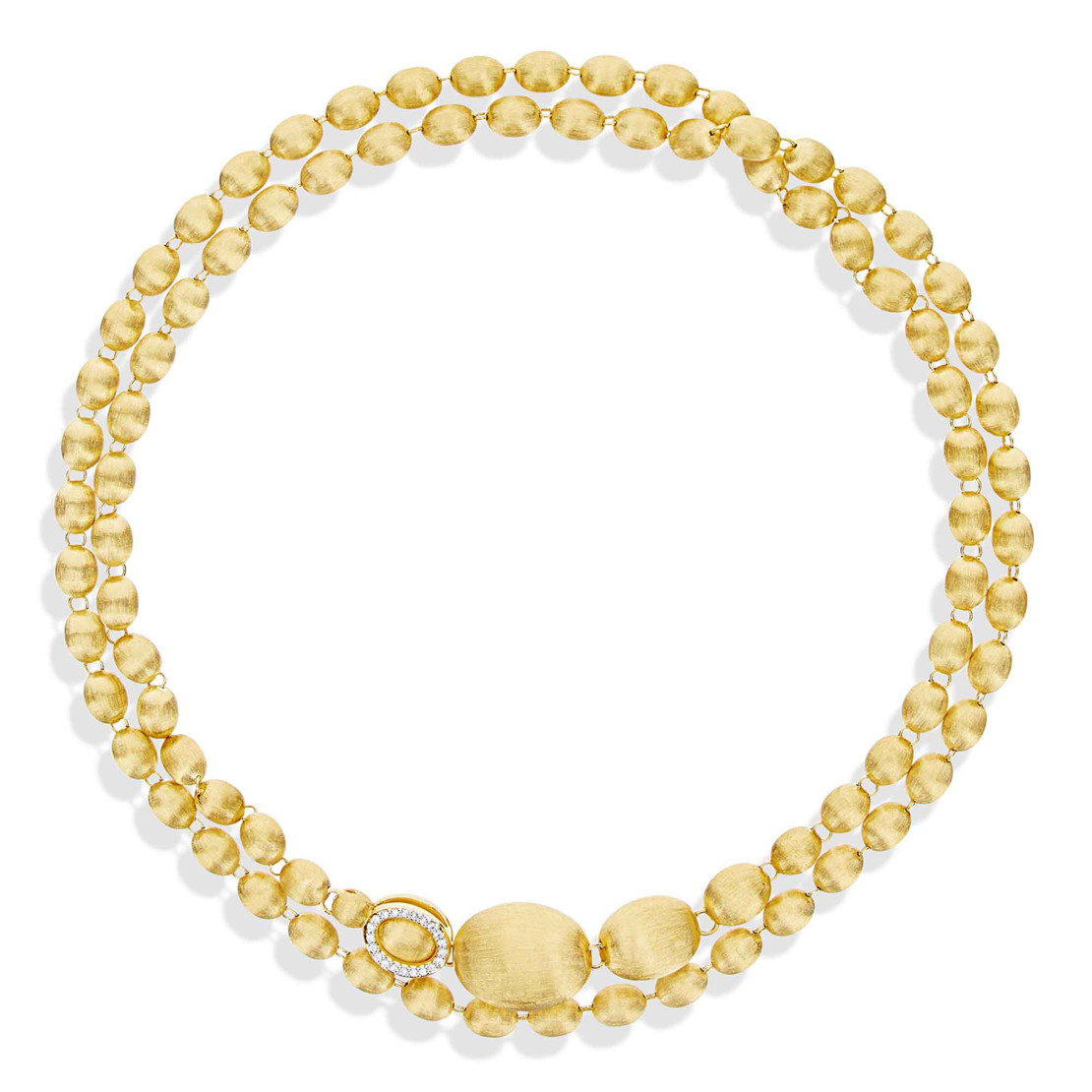 Ref. CS34-538 - So sieht für Nanis eine Perlenkette aus: Kugeln aus 18kt Gold, Stück für Stück von Hand graviert, die in einem Verschluss aus Brillanten gipfeln, welcher bereit ist, jede einzelne Kugel an diesem Schmuckstück zu umarmen, und es so für seine unendlichen Möglichkeiten öffnet. Denn dieser Faden aus Goldperlen kann sowohl zu einem sinnlichen Choker werden, aber auch zu einer klassischen Chanel Variante, oder einem unkonventionellen Lariat. Interpretiert sie ganz nach eurem Look und eurer Persönlichkeit!