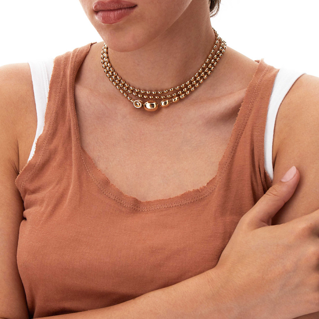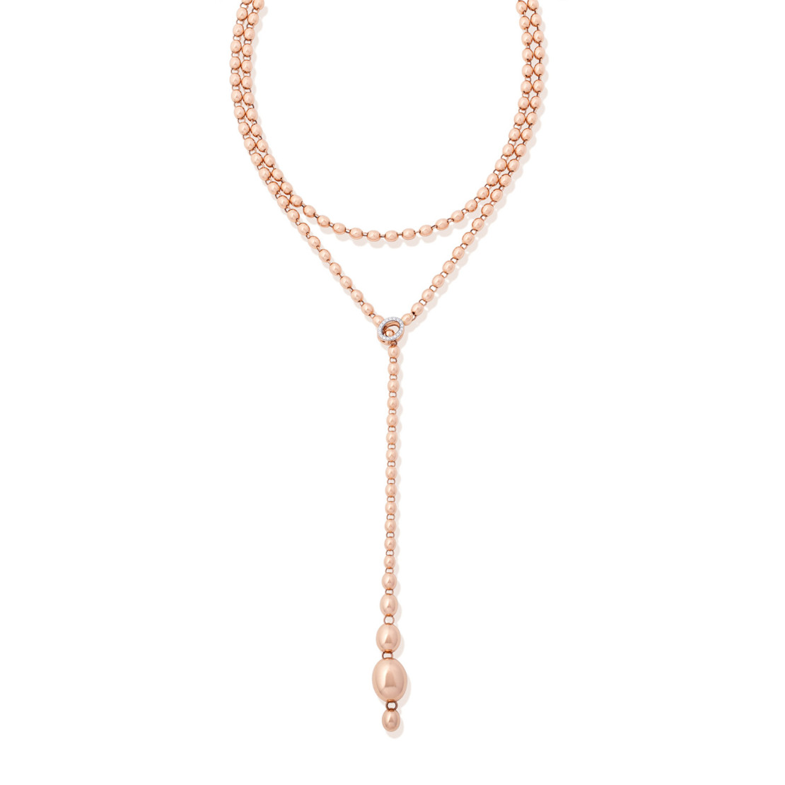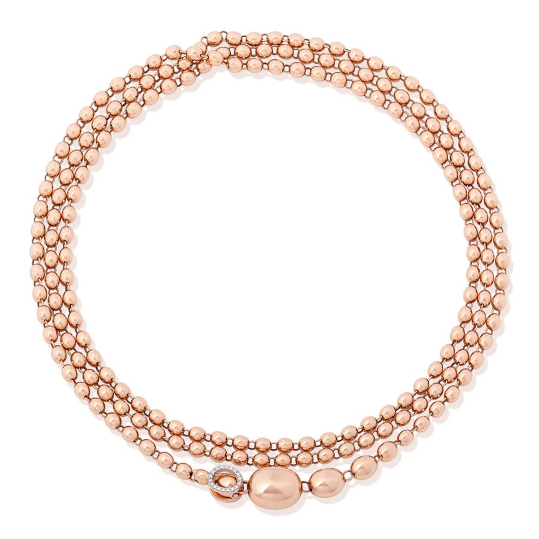 Diese Halskette aus 18kt Roségold und Diamanten charakterisieren ihre eleganten Perlen aus Roségold, einzeln von Hand mit der antiken Stichel-Technik graviert, und überraschend leicht. Erfreut euch daran, dieses Schmuckstück zu interpretieren, es eurem Look anzupassen, und seine unendlichen Möglichkeiten zu erforschen, von den eher klassischen bis zu den sinnlicheren.