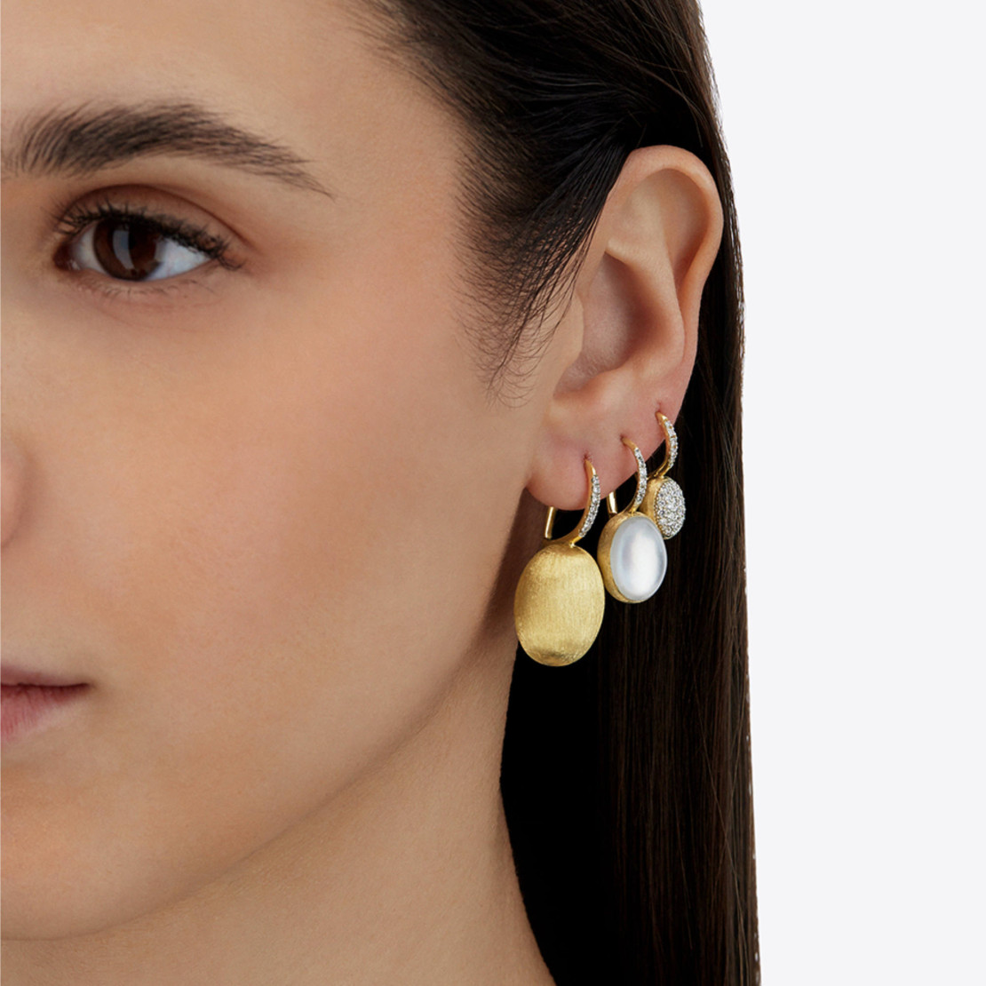 Ref. OS14-609 - Eine Sommernacht, eine Brise auf der Haut, der Himmel vom Mondschein erhellt. In der Nuance Dolcevita trifft Perlmutt auf Boule – die ikonische Form von Nanis – in einem Spiel aus schillernden Lichtreflexen, die den Glanz noch verstärken. Die von Hand gravierten Ciliegine-Ohrringe aus 18 KT Gold kombinieren Bergkristall und Perlmutt in einer harmonischen Umarmung und zelebrieren zeitlose Eleganz und die Schönheit der Materie.