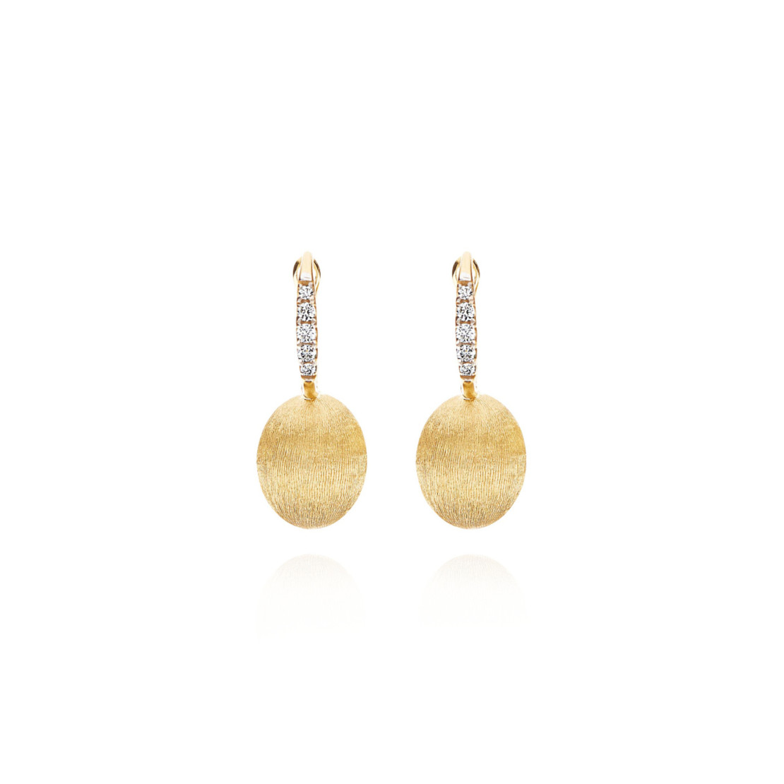 Ref. OS17-583 - Raffinierte Ohrringe aus 18kt Gold, gekrönt von eleganten Details aus Diamanten. Die ausgefeilte Bearbeitung des Goldes spielt mit dem Licht, spiegelt es suggestiv wider, und besiegelt dadurch die Begegnung von Natur und Handwerk.
