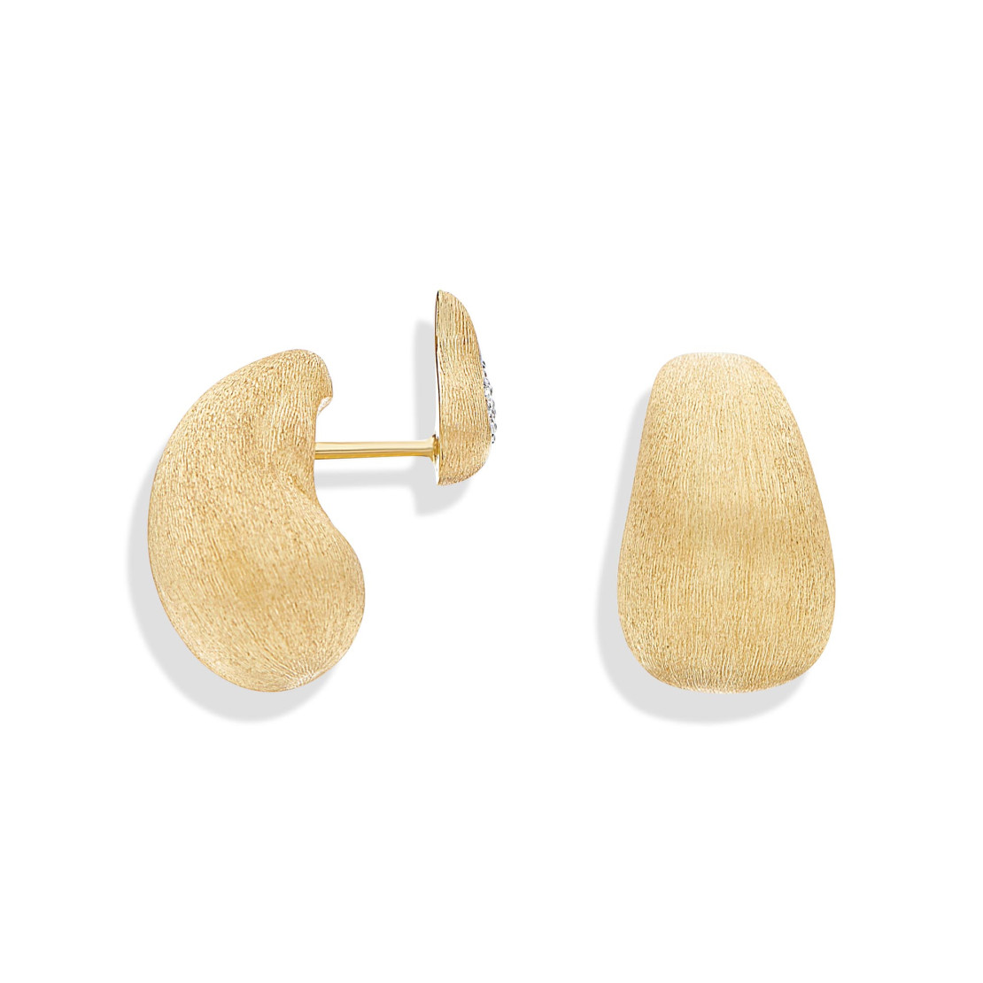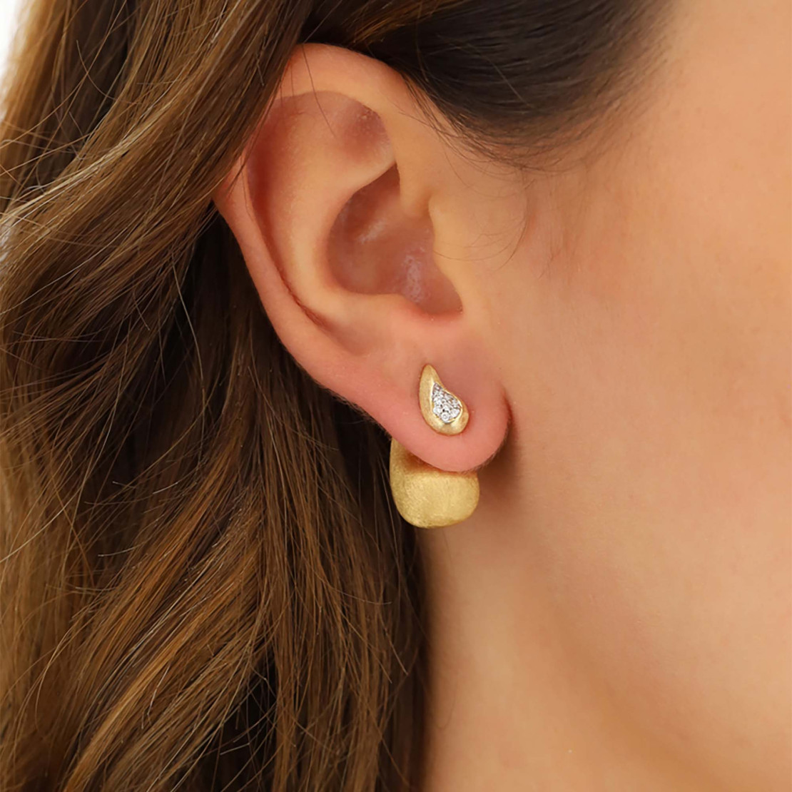 Ref. OS9-569 - Zwei Tröpfchen aus Brillanten, in die warme Umarmung von 18kt Gold getaucht, das von Goldschmieden von Hand graviert wurde. Für diese Ohrringe wurden spezielle Stecker entwickelt, die über eine Lamelle verfügen, die den oberen Teil des Ohrringes stützt und dadurch einen perfekten Sitz garantiert. Ein kleines Kunstwerk zum Anziehen!