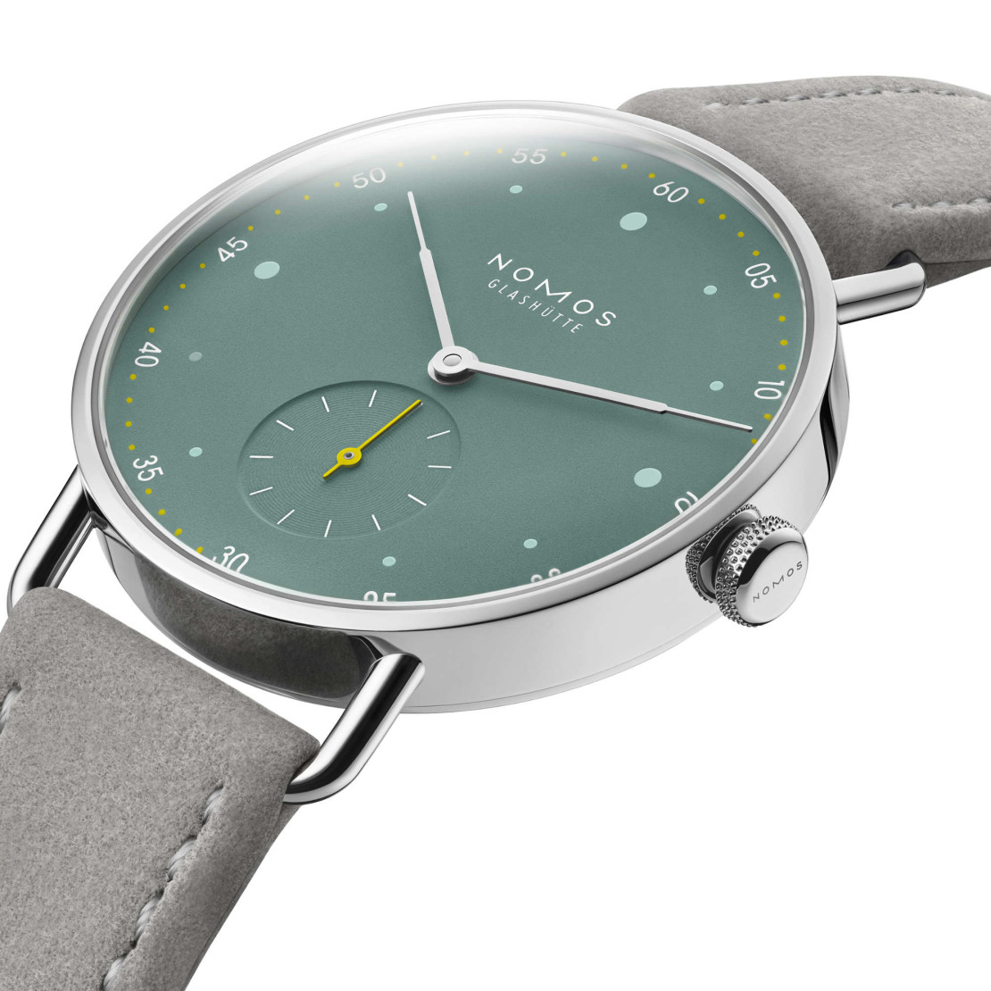 Ref. 1124.SB - Der Salbeiton des Zifferblatts dieser Handaufzugsuhr im Design von Mark Braun erinnert an die offene See ebenso wie an die Patina von Kupferdächern. Großstadt mit einer Brise Meeresluft, tragbar gemacht in einem Edelstahlgehäuse mit geschmeidigen Bügelanstößen und gewölbten Saphirglas. Metro 33 sage ist wasserdicht bis 5 atm und wird vom NOMOS-Manufakturkaliber Alpha angetrieben. Mechanische Zeitmessung für das Leben in der Metropole.