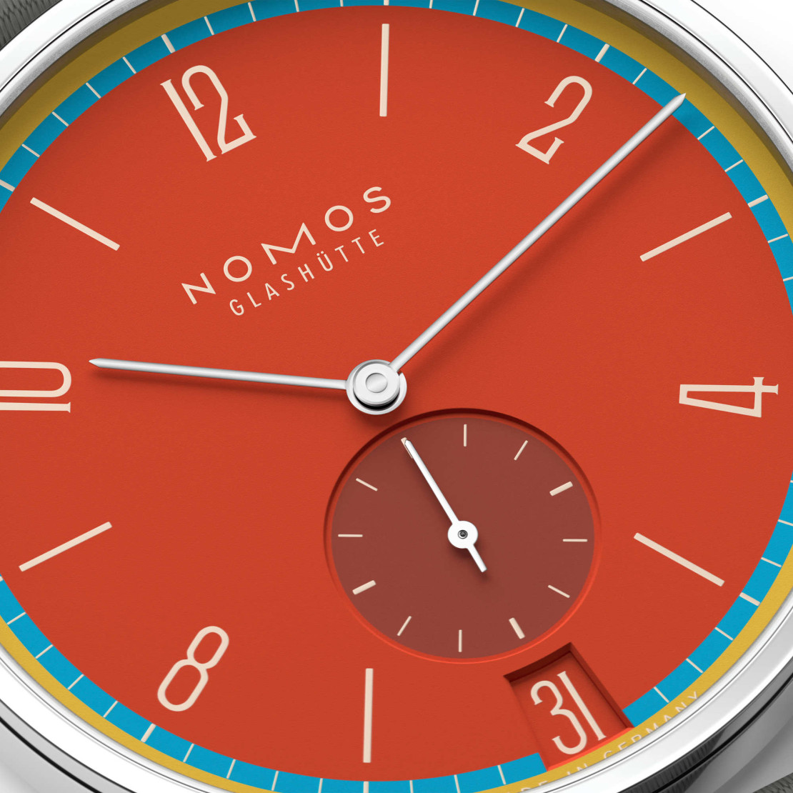 Minutenring türkis, Außenring goldgelb, Sekunde dunkelrot