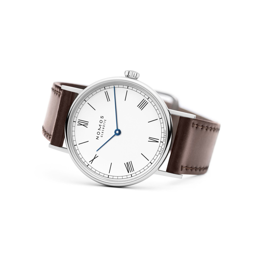 Ref. 249 - 175 Jahre Glashütter Tradition ins Heute übersetzt: NOMOS-Klassiker Ludwig mit römischen Ziffern auf glänzend emailleweißem Grund. Als Zwei-Zeiger-Modell mit einem Durchmesser von 33 Millimetern steht Ludwig 33 Duo zarten Handgelenken besonders gut.