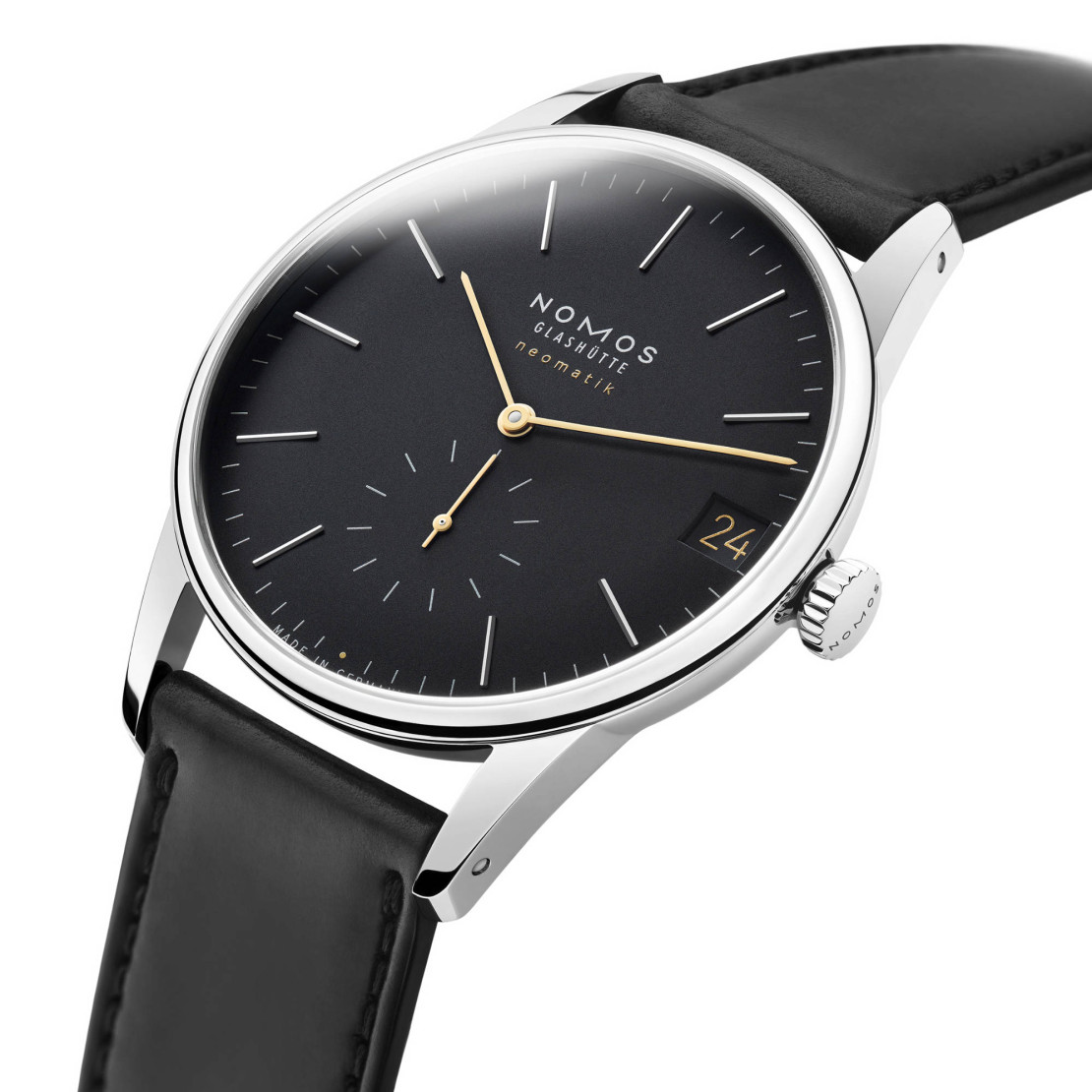 Glashütter Dreiviertelplatine; doppelt verschraubte NOMOS-Unruhbrücke; beidseitig aufziehender Rotor mit vergoldeter, erhabener Gravur; DUW Reguliersystem; feinreguliert in sechs Lagen; temperaturgebläute Schrauben; rhodinierte Werkoberflächen mit Glashütter Streifenschliff und NOMOS-Perlage; vergoldete Gravuren