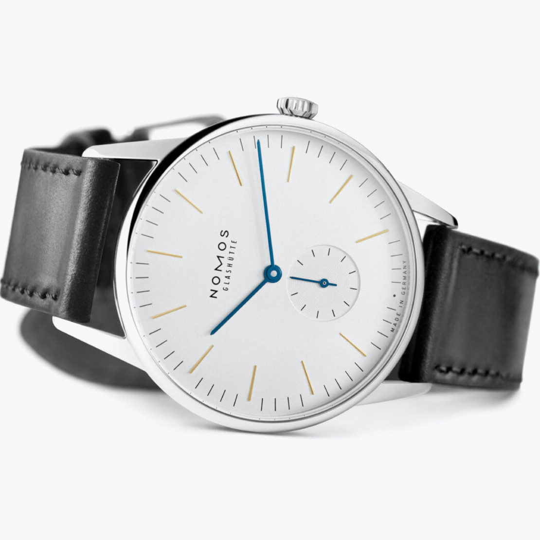 Ref. 387 - Eine Uhr wie ein Fixstern über Glashütte – mit 38 Millimetern Durchmesser, temperaturgebläuten Zeigern und goldenen Indizes auf weiß versilbertem Blatt scheint sie fast zu leuchten. Diese Orion wirkt durch ihre Größe noch flacher, eleganter. Im Innern arbeitet auch hier das erste NOMOS-Kaliber: Alpha mit Handaufzug.