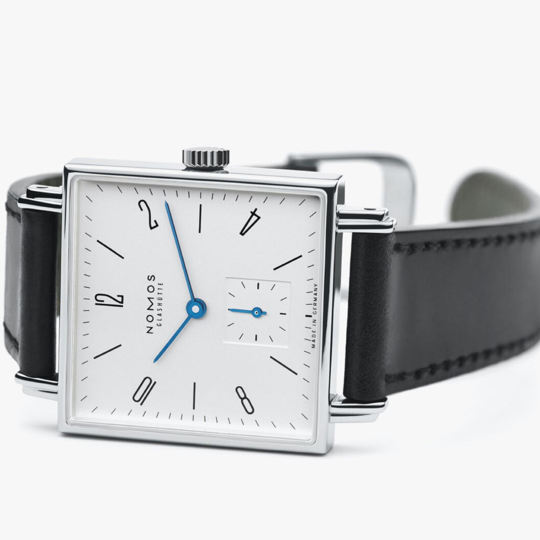 Ref. 408 - Kantiges Äußeres, klassische innere Werte: In Tetra verliebt man sich sofort oder nie – aber wen es einmal erwischt, den lässt diese Uhr nicht mehr los. Weiß versilbertes Zifferblatt, temperaturgebläute Zeiger, kein Firlefanz. Stil zum Quadrat für Menschen mit Charakter.