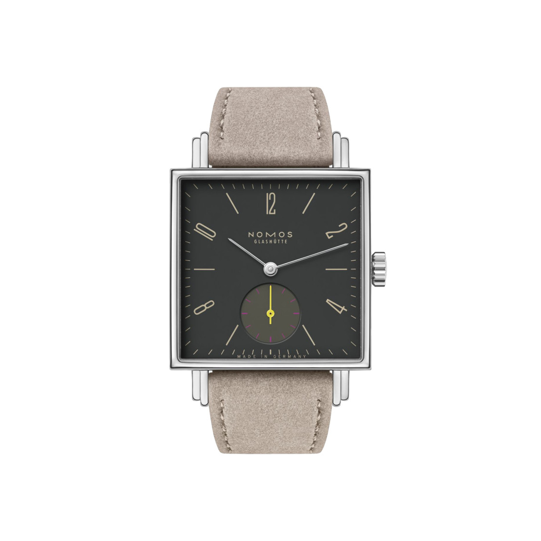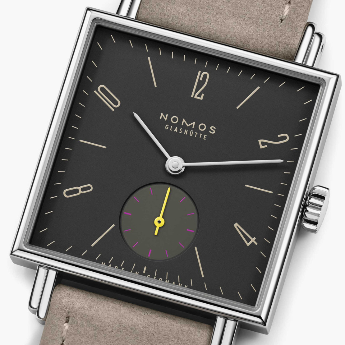Ref. 440 - Diese außergewöhnliche Uhr in Anthrazit verbindet elementare Schönheit mit der Reinheit der Form. Der vulkanische Farbton hat Tiefe und fällt zugleich ins Auge, er bildet einen Kontrast zum glänzenden Edelstahl des Gehäuses und verleiht der quadratischen Silhouette Kraft und Charisma. Tetra Basalt hat Persönlichkeit und verfügt über die dauerhafte Modernität guten Designs. Das mechanische Kaliber im Inneren genießt Glashütter Herkunftsschutz.