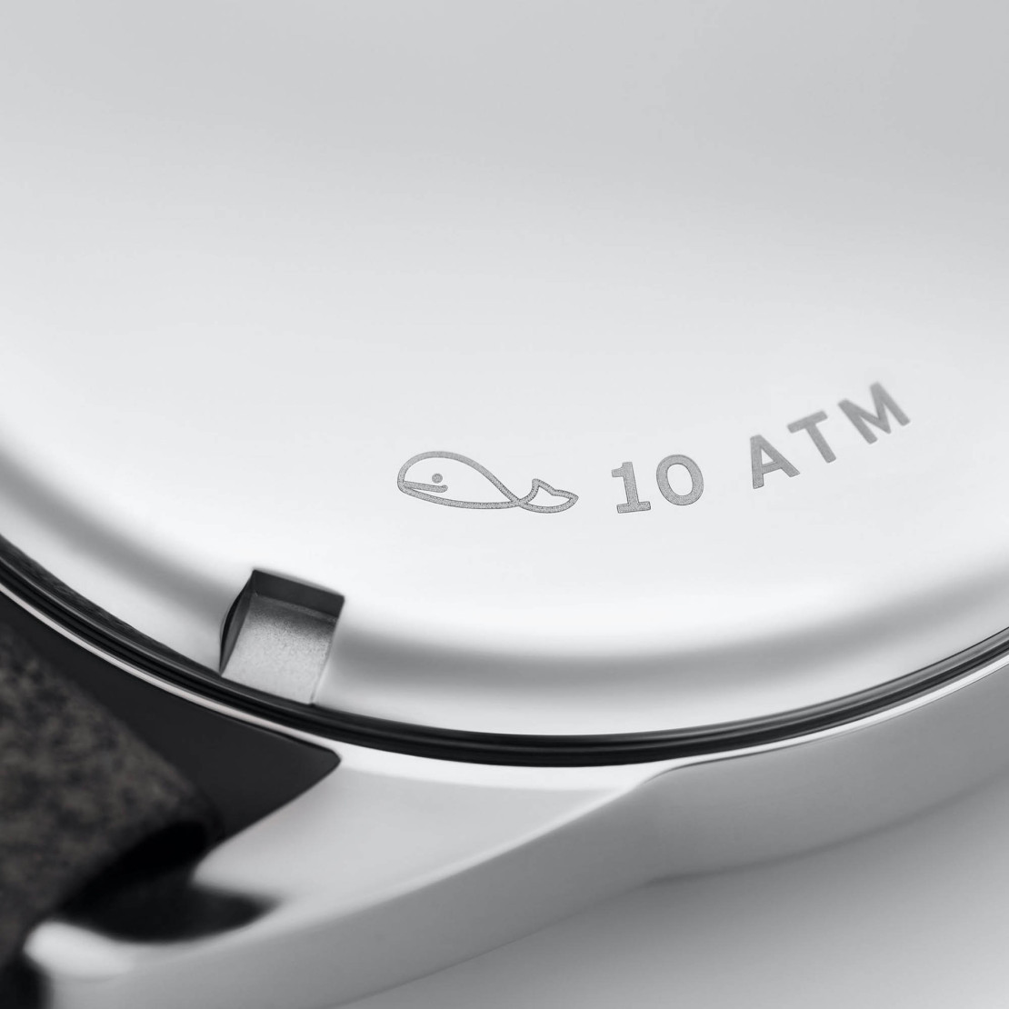 Zeiger rhodiniert, mit Superluminova weiß ausgelegt (blau nachleuchtend), Sekundenzeiger neonorange