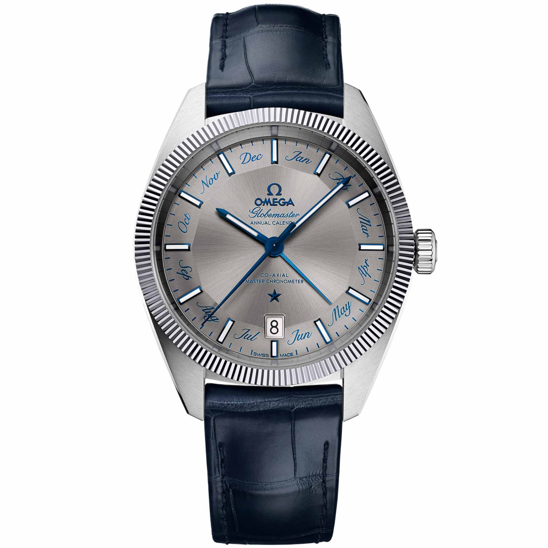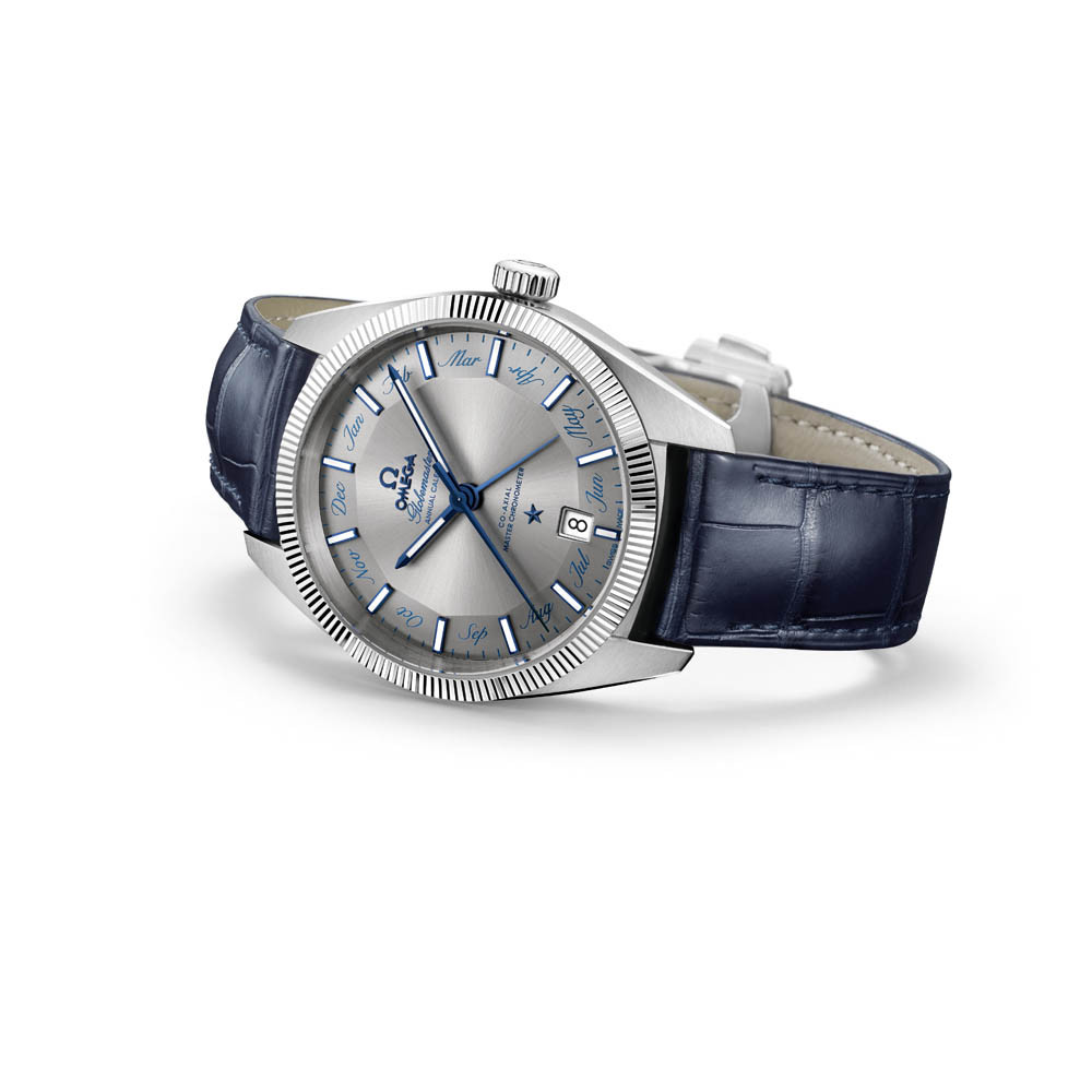 Die Uhr ist mit einem blauen Lederarmband ausgestattet und wird von OMEGAs Co-Axial Master Chronometer Annual Calendar-Kaliber 8922 mit revolutionärer antimagnetischer Technologie angetrieben.