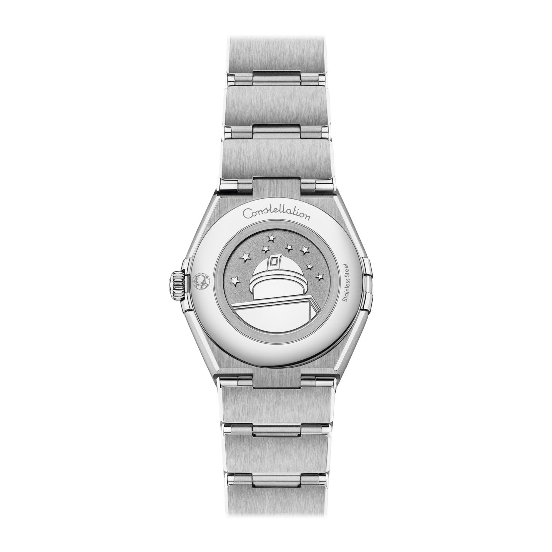 Ref. 131.10.28.60.03.001 - Das spektakuläre und langlebige Design der OMEGA Constellation zeichnet sich durch die berühmten Halbmonde, die „Krappen“ am Gehäuse und das Monoblock-Armband aus. Dieses 28-mm-Modell mit Gehäuse und Armband aus Edelstahl ist mit Indizes und applizierten Elementen aus 18 K Weißgold auf einem leuchtend himmelblauen Zifferblatt versehen. Um der Lünette einen besonderen Farbakzent zu verleihen, hat OMEGA die eingravierten römischen Ziffern mit der gleichen Pastellfarbe hervorgehoben. Das Herzstück dieses Zeitmessers bildet das OMEGA Kaliber 4061. Wendet man die Uhr, so kommt das in den Gehäuseboden geprägte Constellation Observatoriumsmedaillon zum Vorschein.