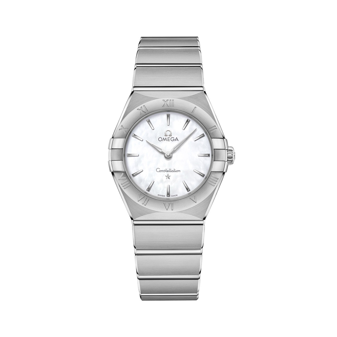 Ref. 131.10.28.60.05.001 - Das spektakuläre und langlebige Design der OMEGA Constellation zeichnet sich durch die berühmten Halbmonde, die „Krappen“ am Gehäuse und das „Mono-Rang“-Armband aus. Dieses 28 mm große Modell in Edelstahl verfügt über eine mit römischen Ziffern gravierte Lünette, ein weißes Perlmuttzifferblatt und ein kratzresistentes Saphirglas. Die Zeiger, das OMEGA Logo, der Constellation-Stern und die Indizes sind aus 18 K Weißgold. Das Herzstück dieser Uhr bildet das OMEGA Kaliber 4061. Auf dem Gehäuseboden findet sich eine Prägung des Constellation-Observatoriumsmedaillons.