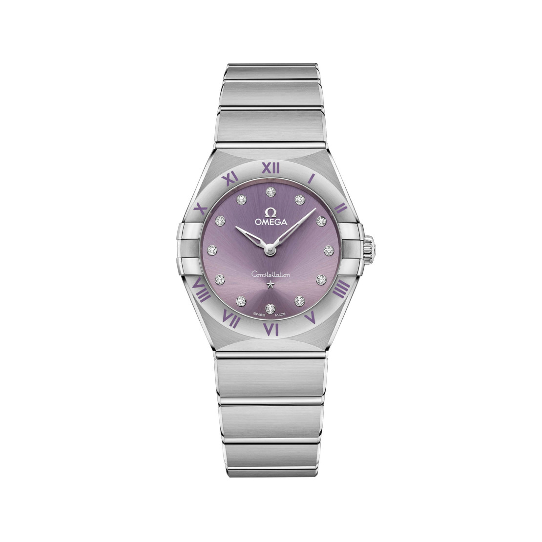 Ref. 131.10.28.60.60.002 - Das spektakuläre und langlebige Design der OMEGA Constellation zeichnet sich durch die berühmten Halbmonde, die „Krappen“ am Gehäuse und das Monoblock-Armband aus. Dieses 28-mm-Modell mit Gehäuse und Armband aus Edelstahl ist mit Indizes und applizierten Elementen aus 18 K Weißgold auf einem leuchtend patschulifarbenen Zifferblatt versehen. Um der Lünette einen besonderen Farbakzent zu verleihen, hat OMEGA die eingravierten römischen Ziffern mit der gleichen Pastellfarbe hervorgehoben. Das Herzstück dieses Zeitmessers bildet das OMEGA Kaliber 4061. Wendet man die Uhr, so kommt das in den Gehäuseboden geprägte Constellation Observatoriumsmedaillon zum Vorschein.