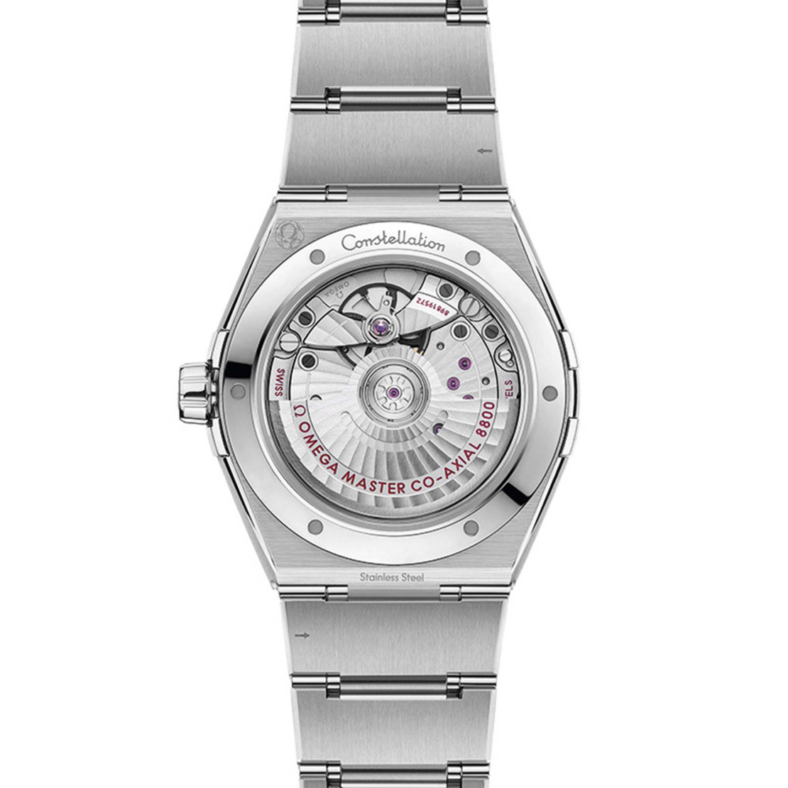Zeiger, das OMEGA Logo, der Constellation-Stern und die Indizes sind allesamt aus 18 K Weißgold