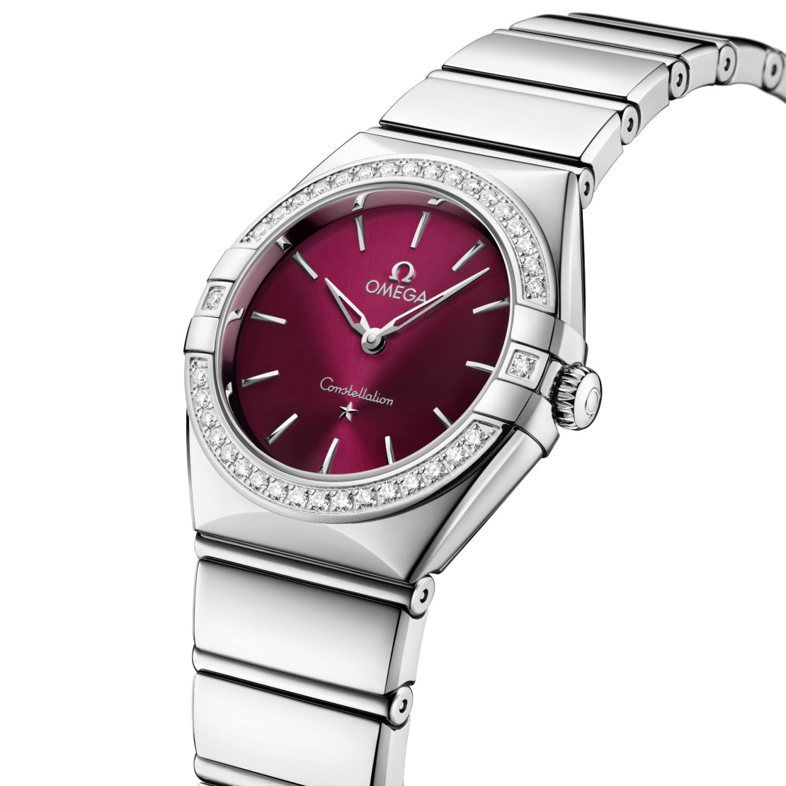 Dieses 28-mm-Modell wurde aus Edelstahl gefertigt und ist mit einer strahlenden diamantbesetzten Lünette versehen. Das burgunderrote Zifferblatt mit Sonnenschliff wurde mit einer getönten Lackierung versehen. Weitere Details sind die polierten und skelettierten, aus 18 K Weißgold gefertigten Zeiger und der Stern bei sechs Uhr sowie die Stundenindizes aus poliertem 18 K Weißgold.