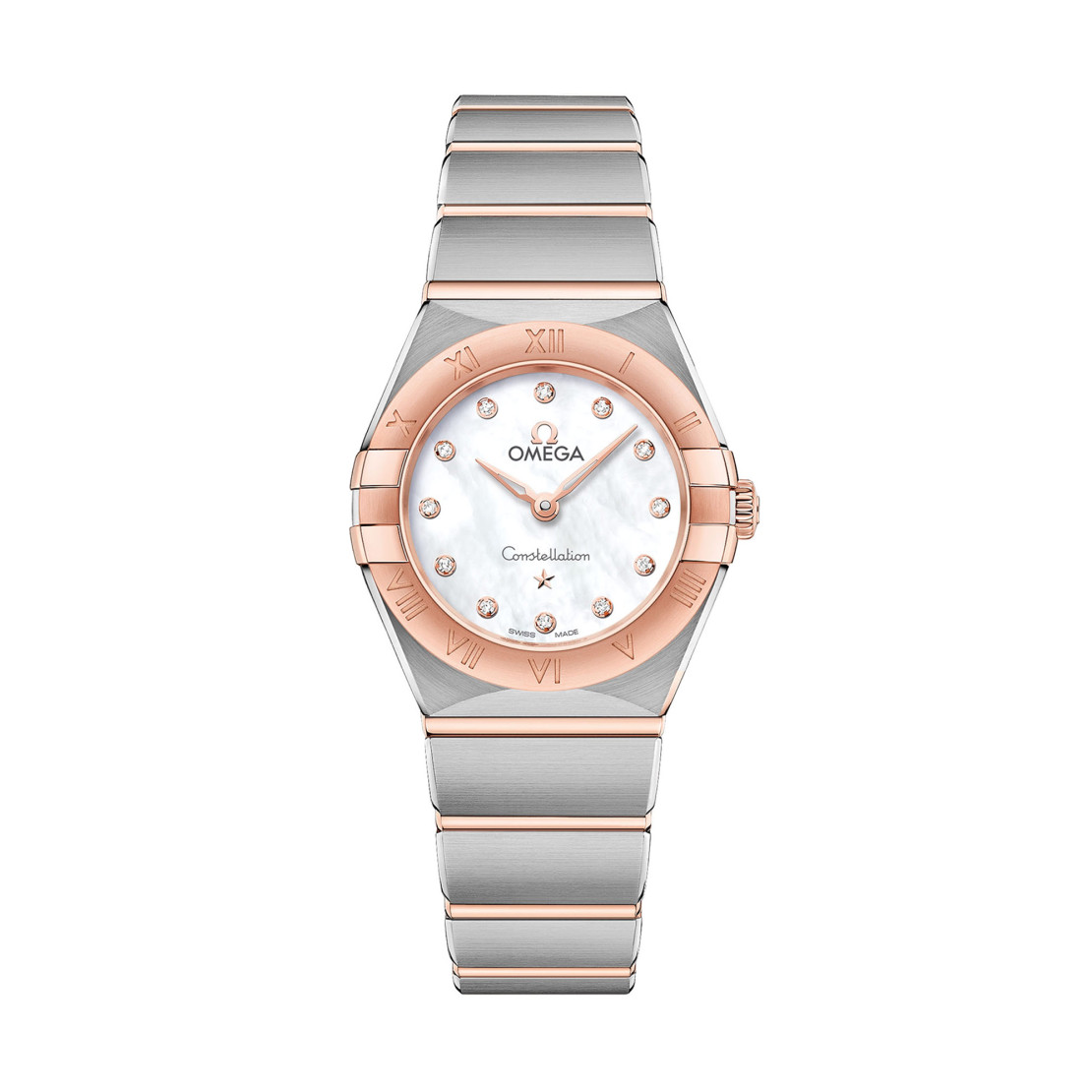 Ref. 131.20.25.60.55.001 - Das spektakuläre und langlebige Design der OMEGA Constellation zeichnet sich durch die berühmten Halbmonde, die „Krappen“ am Gehäuse und das „Mono-Rang“-Armband aus. Dieses 25 mm große Modell in 18 K Sedna™-Gold und Edelstahl verfügt über eine mit römischen Ziffern gravierte Lünette, ein weißes Perlmuttzifferblatt mit Diamantstundenmarkierungen und ein kratzresistentes Saphirglas. Die Zeiger, das OMEGA Logo, der Constellation-Stern und die Diamantfassungen sind ebenfalls aus 18 K Sedna™-Gold. Das Herzstück dieser Uhr bildet das OMEGA Kaliber 4061. Auf dem Gehäuseboden findet sich eine Prägung des Constellation-Observatoriumsmedaillons.