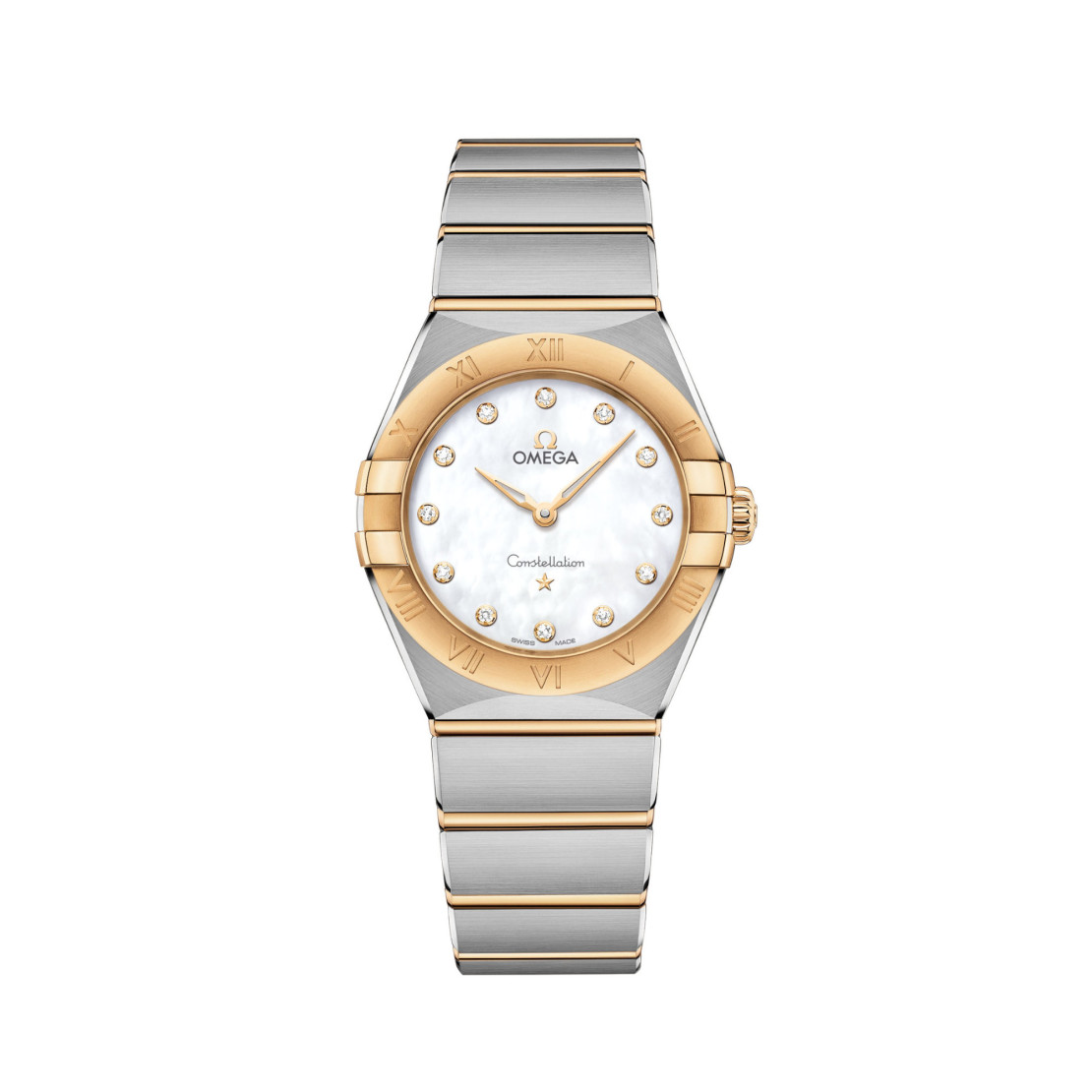 Die Zeiger, das OMEGA Logo, der Constellation-Stern und die Diamantfassungen sind ebenfalls aus 18 K Gelbgold