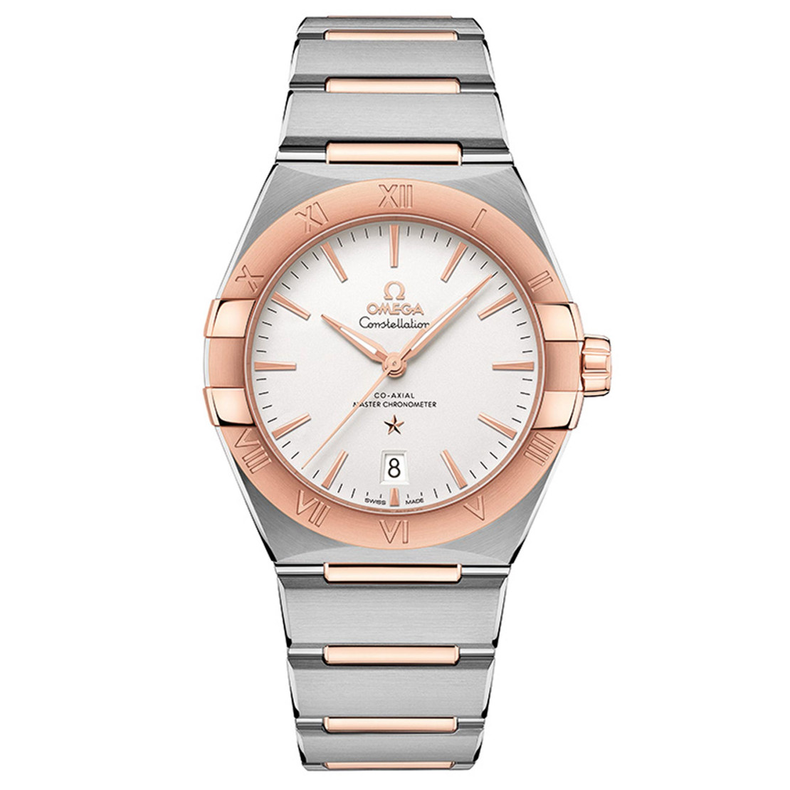 Ref. 131.20.39.20.02.001 - Das spektakuläre und langlebige Design der OMEGA Constellation zeichnet sich durch die berühmten Halbmonde, die „Krappen“ am Gehäuse und das „Mono-Rang“-Armband aus. Dieses 39 mm große Modell in Edelstahl und 18 K Sedna™-Gold verfügt über eine mit römischen Ziffern gravierte Lünette, ein opalweißes versilbertes Zifferblatt und ein Datumsfenster bei 6 Uhr. Die Zeiger, das OMEGA Logo, der Constellation-Stern und die Indizes sind allesamt aus 18 K Sedna™-Gold. Das Herzstück dieses Zeitmessers bildet das OMEGA Co-Axial Master Chronometer-Kaliber 8800, das durch das gewölbte kratzresistente Saphirglas bewundert werden kann.