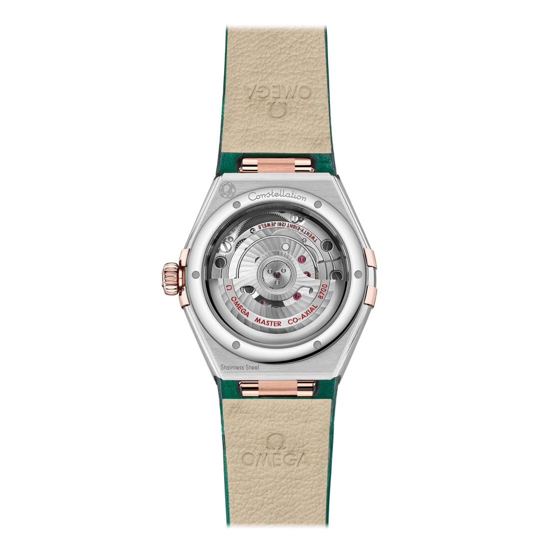 Ref. 131.23.29.20.99.001 - Das spektakuläre und langlebige Design der OMEGA Constellation zeichnet sich durch die berühmten Halbmondfacetten und die „Krappen“ am Gehäuse aus. Die Standard-Eigenschaften dieses 29-mm-Modells sind das Zifferblatt aus natürlichem grünem Aventurin und das schimmernde Lederarmband in passender Farbe. Die aus Edelstahl und 18 K Sedna™-Gold gefertigte Uhr besitzt eine mit römischen Ziffern gravierte Lünette und ein Datumsfenster bei 6 Uhr. Die Zeiger, die Stundenindizes, das OMEGA Logo und der Constellation-Stern bestehen aus 18 K Sedna™-Gold. Das Herzstück dieses Zeitmessers bildet das OMEGA Co-Axial Master Chronometer-Kaliber 8700, das durch das gewölbte kratzresistente Saphirglas bewundert werden kann.