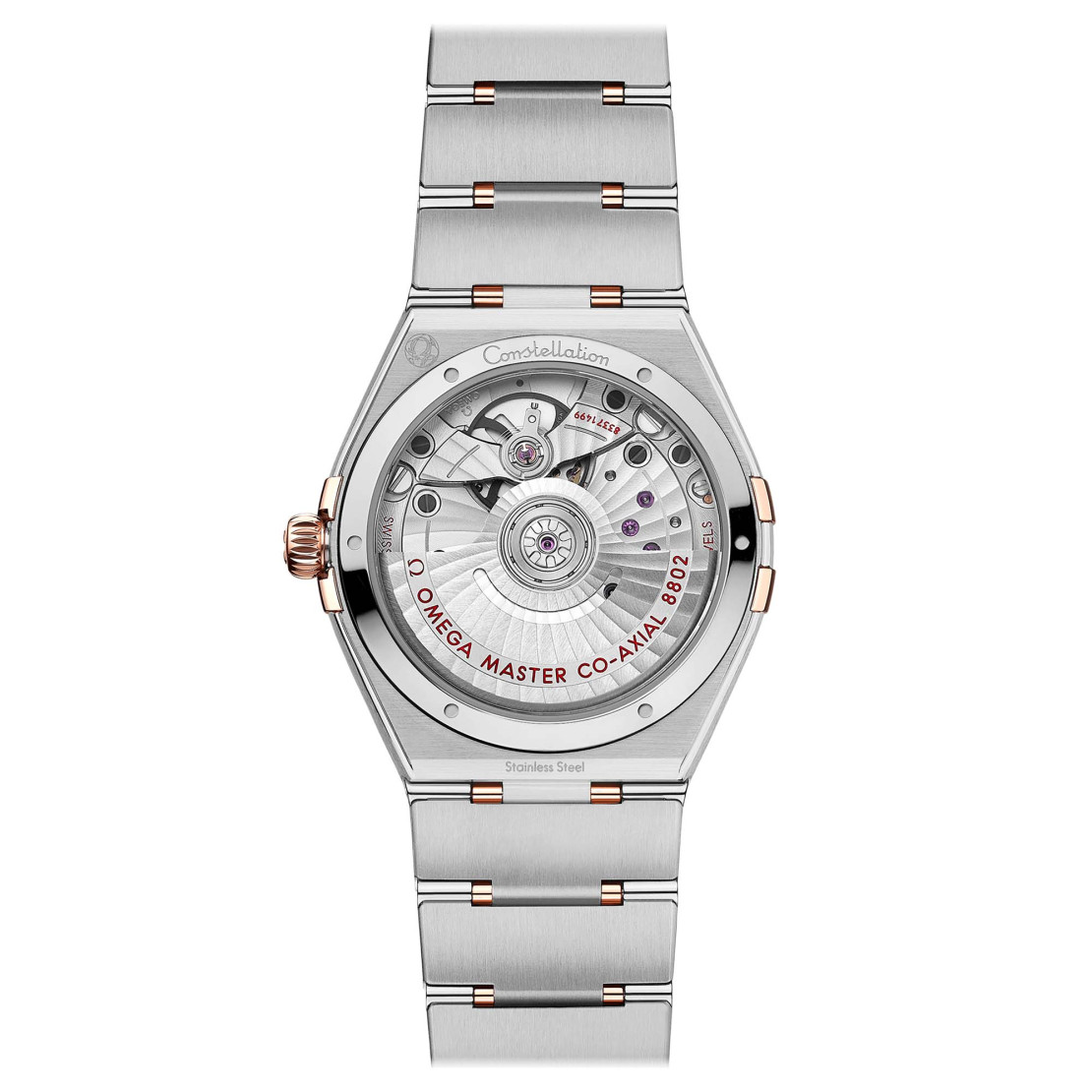 Ref. 131.25.34.20.55.001 - Das spektakuläre und langlebige Design der OMEGA Constellation zeichnet sich durch die berühmten Halbmondfacetten sowie die „Krappen“ an der Gehäuseseite aus. Dieses 34 mm große Modell aus 18 K Sedna™-Gold und Edelstahl verfügt über eine mit Diamanten besetzte Lünette, ein mattweißes Perlmuttzifferblatt und ein rundes Datumsfenster bei 6 Uhr. Die zulaufenden Diamantstundenindizes verfügen über Fassungen aus 18 K Sedna™-Gold. Der Ring rund um das Hilfszifferblatt für die kleine Sekunde besteht ebenfalls aus 18 K Sedna™-Gold und ist mit Diamanten besetzt. Der Zeitmesser wird von dem ikonischen Mono-Rang-Armband mit Doppelfaltschließe und komfortablem Anpassungssystem am Handgelenk gehalten und von dem OMEGA Co-Axial Master Chronometer Kaliber 8802 angetrieben, das durch das gewölbte, kratzresistente Saphirglas sichtbar ist.