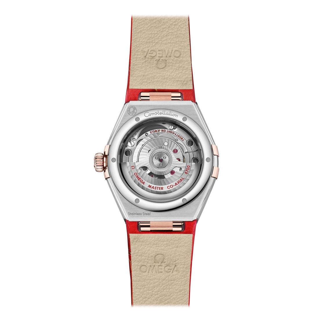 Ref. 131.28.29.20.99.002 - Das spektakuläre und langlebige Design der OMEGA Constellation zeichnet sich durch die berühmten Halbmondfacetten und die „Krappen“ am Gehäuse aus. Die Standard-Eigenschaften dieses 29-mm-Modells sind das Zifferblatt aus natürlichem rotem Aventurin und das schimmernde Lederarmband in passender Farbe. Die aus Edelstahl und 18 K Sedna™-Gold gefertigte Uhr besitzt eine diamantbesetzte Lünette und ein Datumsfenster bei 6 Uhr. Die Zeiger, die Stundenindizes, das OMEGA Logo und der Constellation-Stern bestehen aus 18 K Sedna™-Gold. Das Herzstück dieses Zeitmessers bildet das OMEGA Co-Axial Master Chronometer-Kaliber 8700, das durch das gewölbte kratzresistente Saphirglas bewundert werden kann.