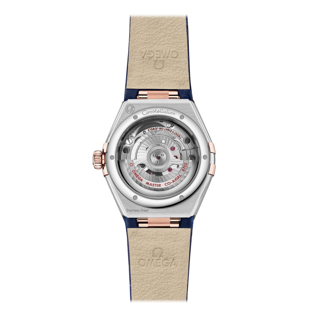 Ref. 131.28.29.20.99.003 - Das spektakuläre und langlebige Design der OMEGA Constellation zeichnet sich durch die berühmten Halbmondfacetten und die „Krappen“ am Gehäuse aus. Die Standard-Eigenschaften dieses 29-mm-Modells sind das Zifferblatt aus natürlichem blauem Aventurin und das schimmernde Lederarmband in passender Farbe. Die aus Edelstahl und 18 K Sedna™-Gold gefertigte Uhr besitzt eine diamantbesetzte Lünette und ein Datumsfenster bei 6 Uhr. Die Zeiger, die Stundenindizes, das OMEGA Logo und der Constellation-Stern bestehen aus 18 K Sedna™-Gold. Das Herzstück dieses Zeitmessers bildet das OMEGA Co-Axial Master Chronometer-Kaliber 8700, das durch das gewölbte kratzresistente Saphirglas bewundert werden kann.