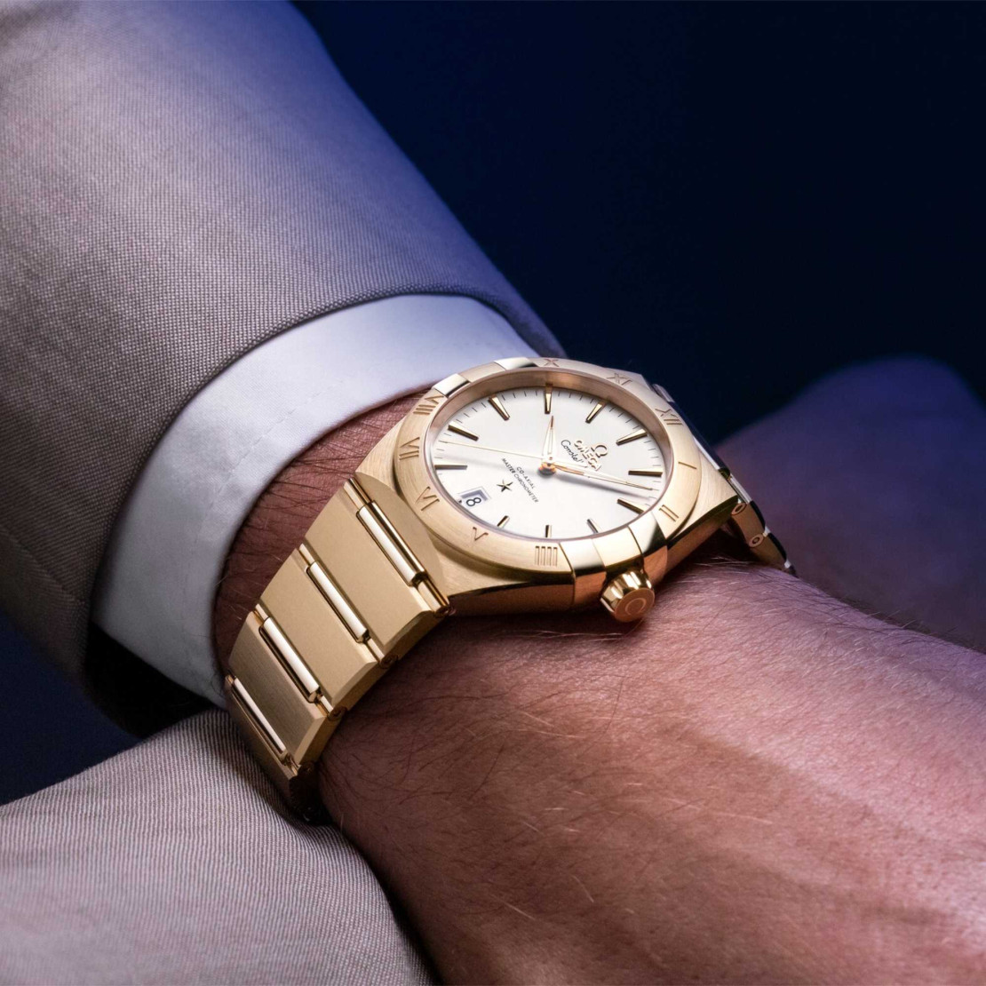 Dieses 39 mm große Modell in 18 K Gelbgold verfügt über eine mit römischen Ziffern gravierte Lünette, ein opalweißes versilbertes Zifferblatt und ein Datumsfenster bei 6 Uhr. Die Zeiger, das OMEGA Logo, der Constellation-Stern und die Indizes sind allesamt aus 18 K Gelbgold.